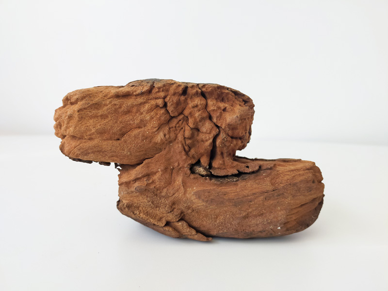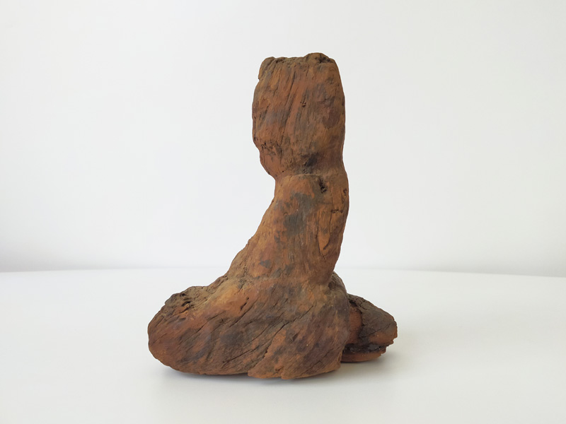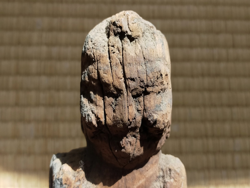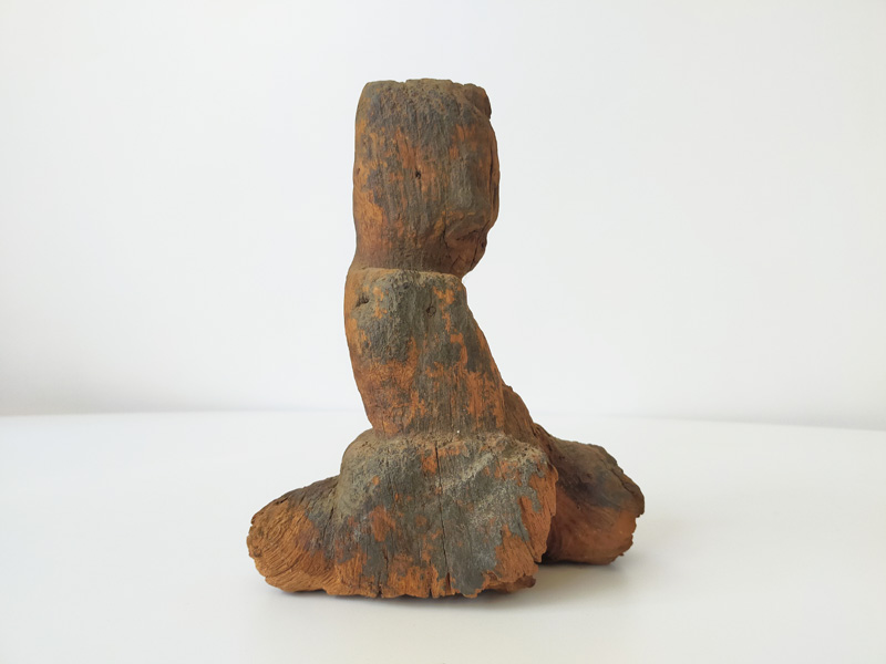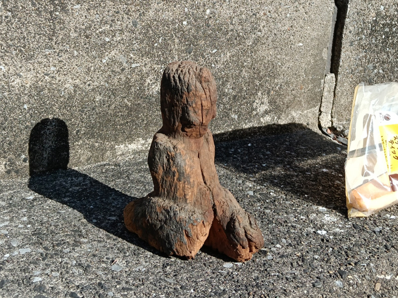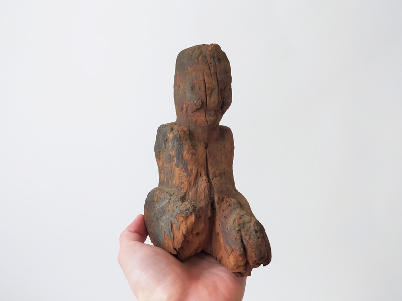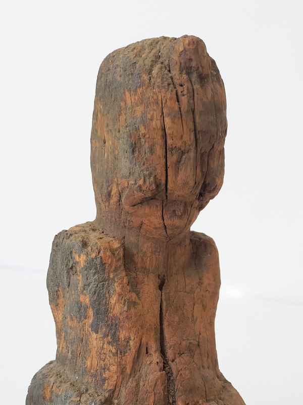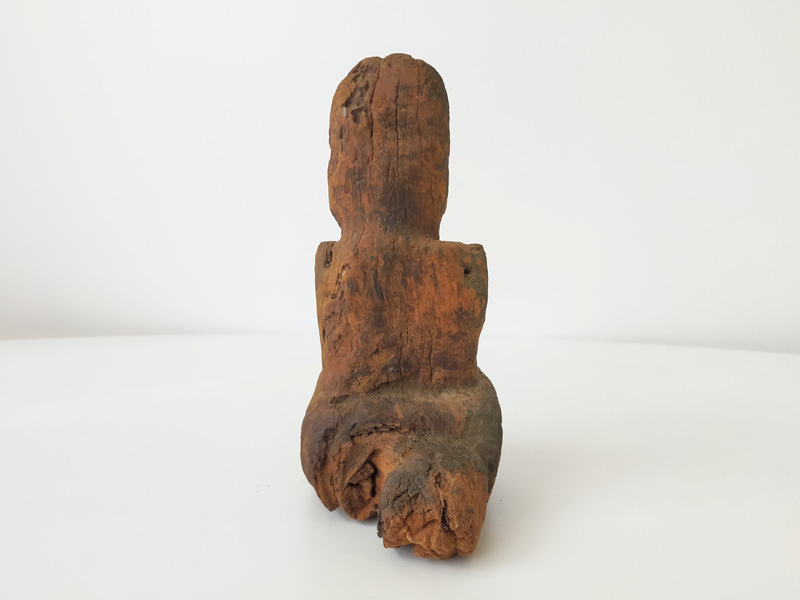 FLOWING BUDDHA (Dealer: titcoRet) – A weathered Japanese wooden Buddhist figure known as ‘Nagare-butsu’ (Flowing Buddha), Edo period (circa 17th–19th century). Approx. 18.5 × 8 × 14 cm (7.3 × 3.1 × 5.5 in). Refers to a category of damaged or broken Buddhist images that were once abandoned, buried, or cast into rivers or mountains for religious reasons. In some cases, such figures were later recovered by believers, re-enshrined, and quietly preserved, allowing them to survive into the present. Due to erosion, wear, and long exposure, the specific Buddhist identity can no longer be determined.