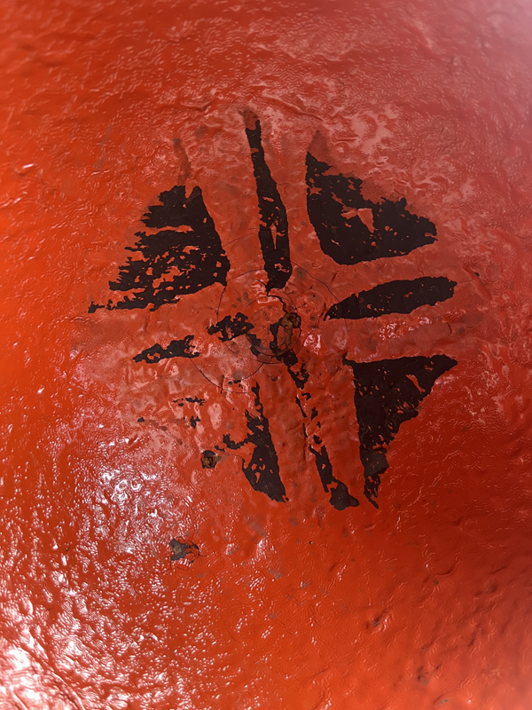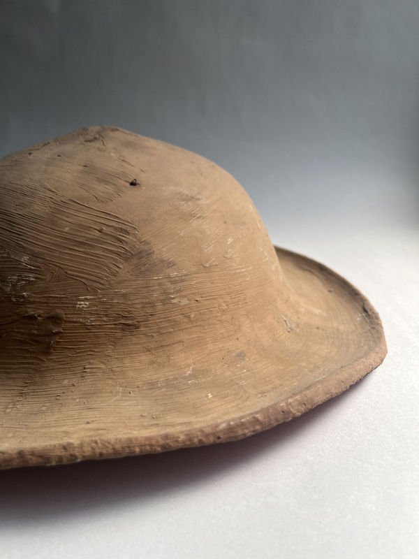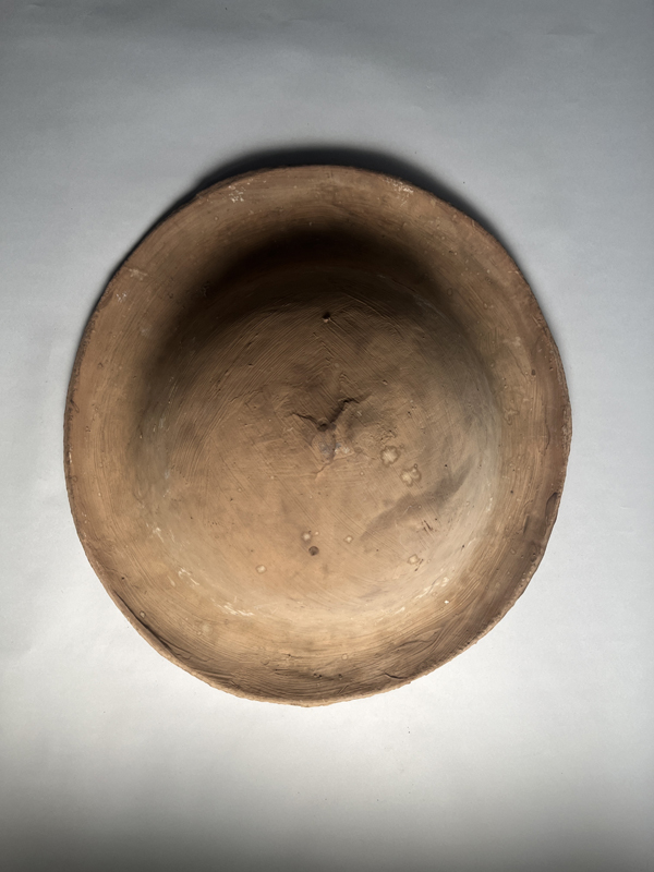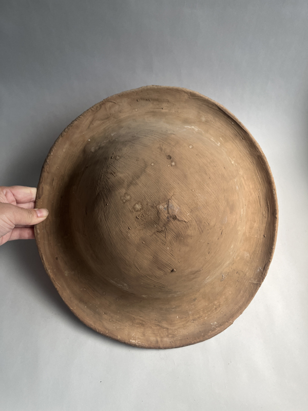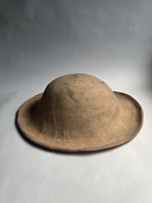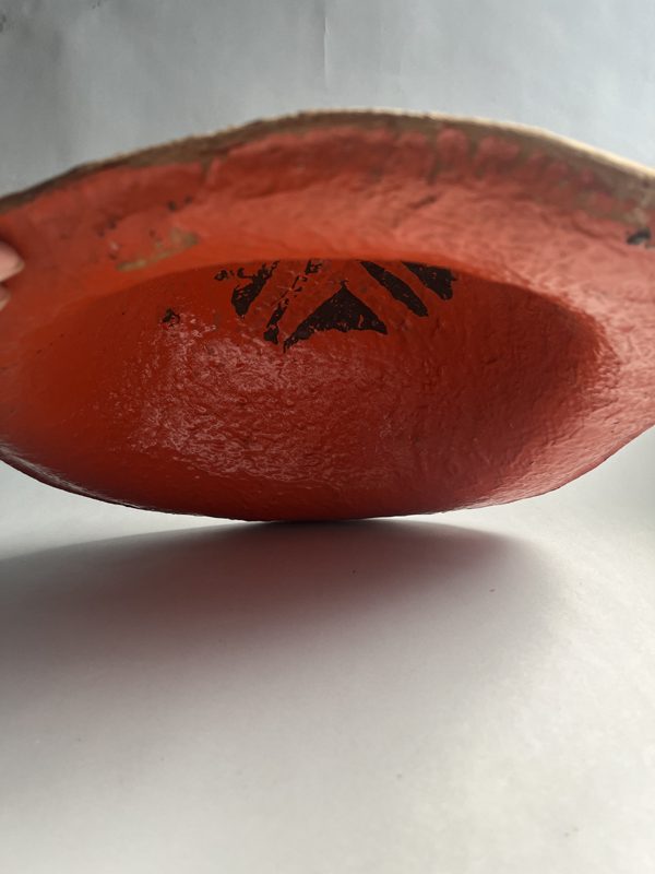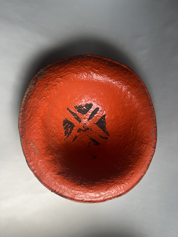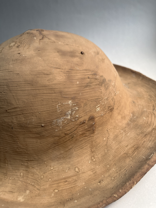 JINGASA (Dealer: Pottari) – A wooden jingasa (warrior’s hat), Japan, Shōwa period, 20th century. Approx. H 10 × W 34 × D 33 cm (3.9 × 13.4 × 13 in). The reverse is partially coated with red lacquer, bearing a painted mark; the front remains with only its undercoat — quiet, unfinished, and be.