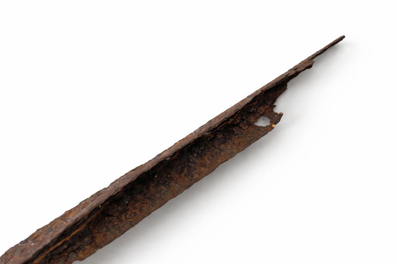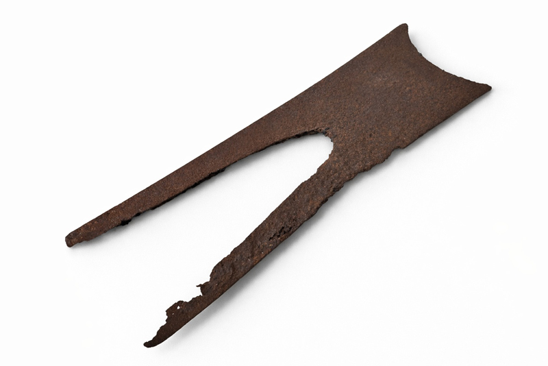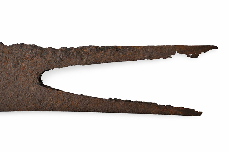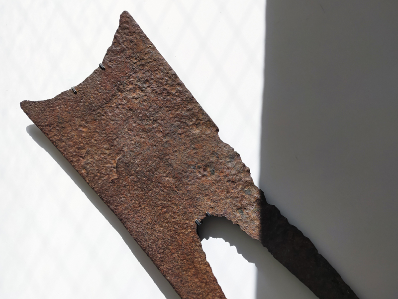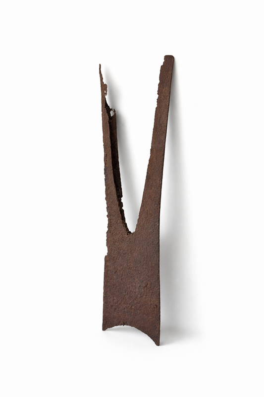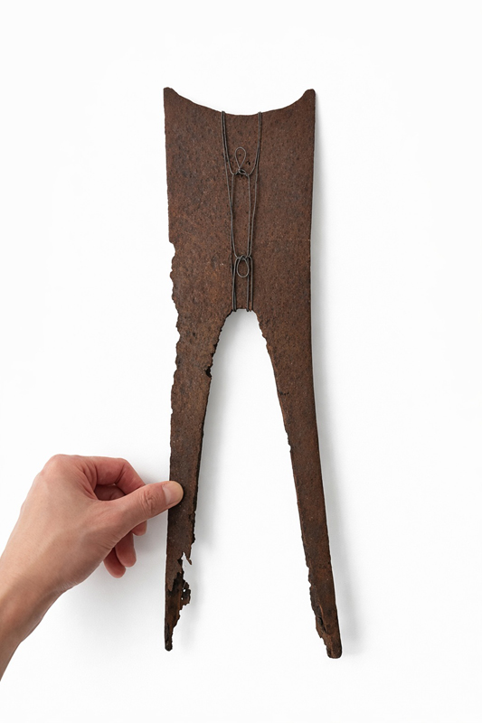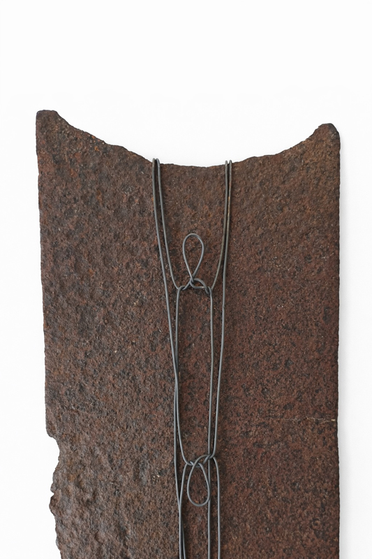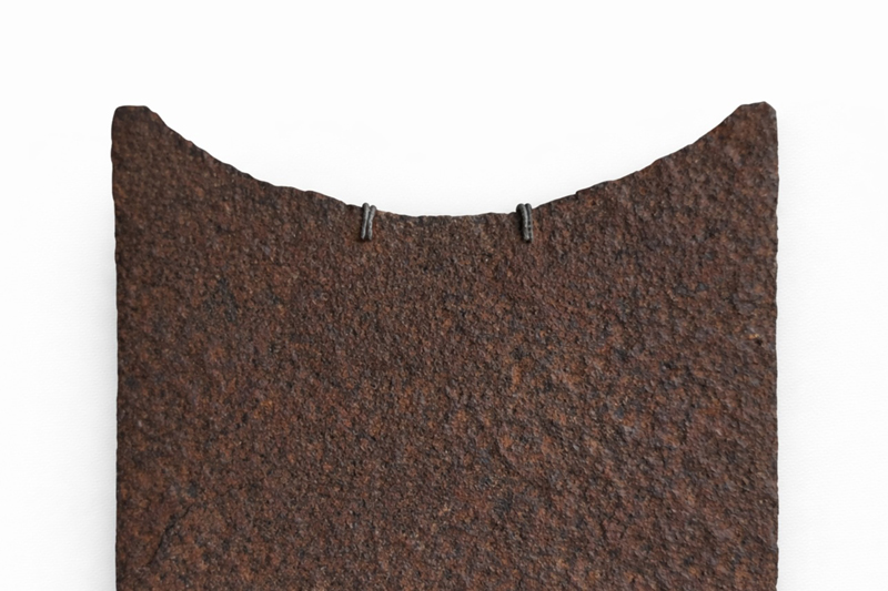 CAST IRON BLANK (Dealer: titcoRet) – A remnant iron cut from agricultural toolmaking that never found a practical use, preserved rather than discarded, and recontextualized in the present as a wall-mounted sculptural object. The attached wire allows it to be hung in either vertical orientation. Japan, Meiji–Taishō period (late 19th–early 20th century). Approx. 40 × 12.4 × 2 cm (15.7 × 4.9 × 0.8 in). Age-related wear consistent with time.