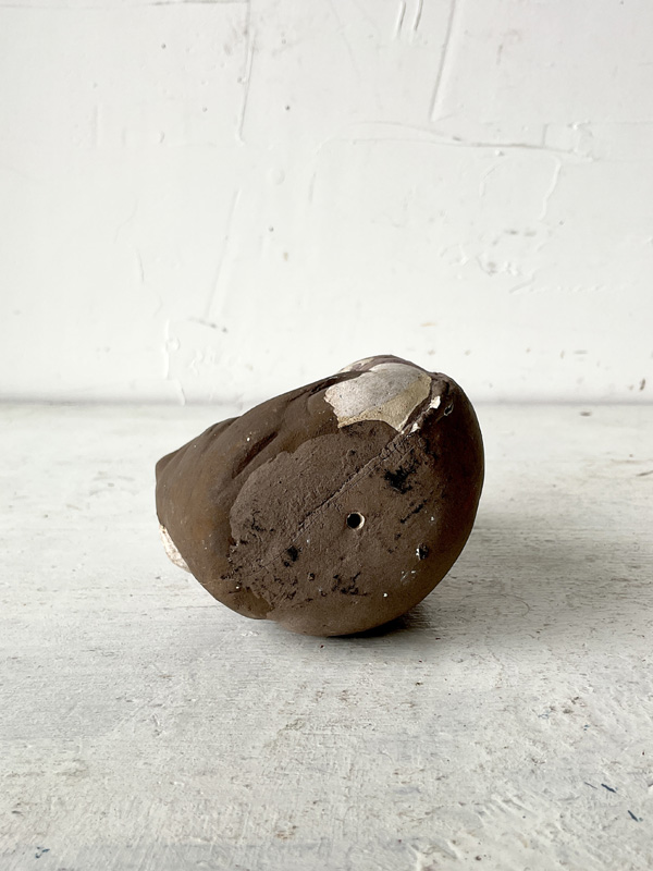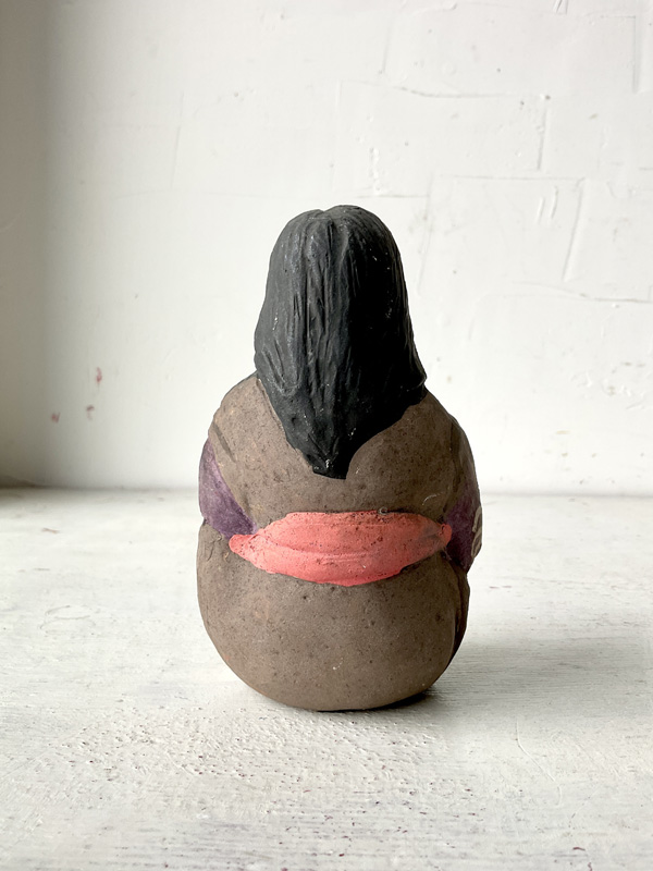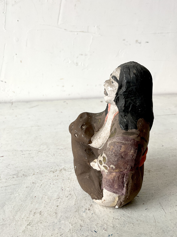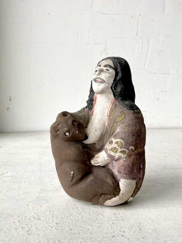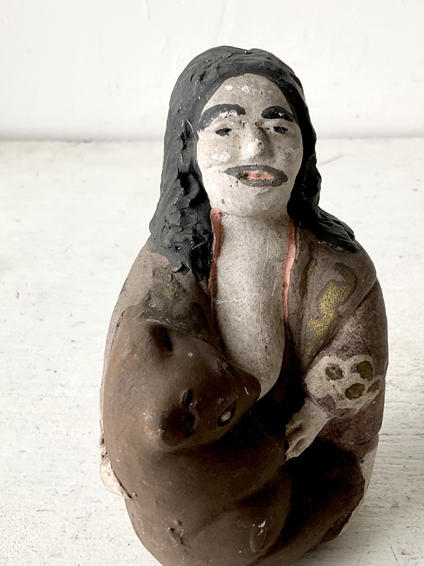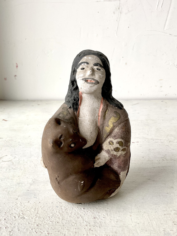 AINU WOMAN NURSING BEAR CUB (Dealer: hotoke) – A Japanese clay figure doll depicting an Ainu woman nursing a bear cub. Shōwa period (20th century). Approx. 12.5 cm (4.9 in) in length — an evocative scene reflecting the practice of raising cubs within the community. Such cubs were kept only for a few years before being ritually sent off in the iomante (bear-sending) ceremony. Age-related wear is present, as shown.