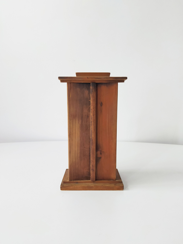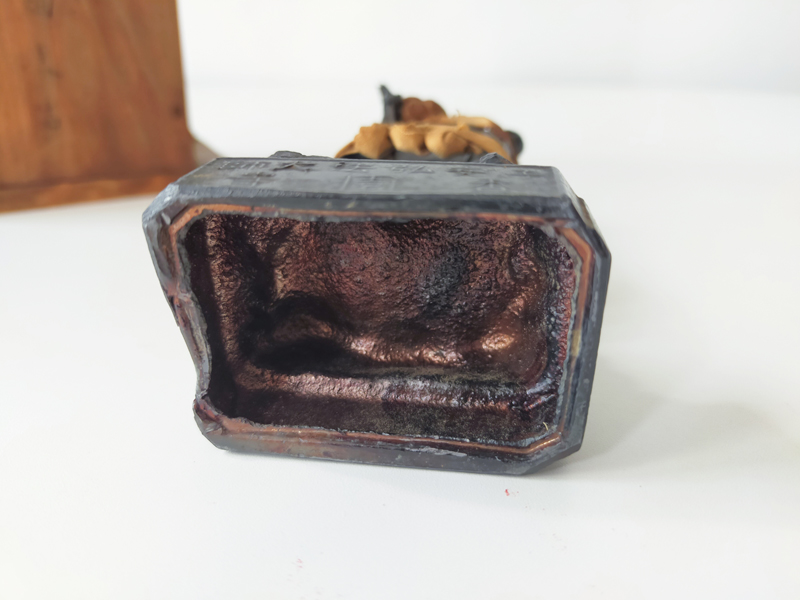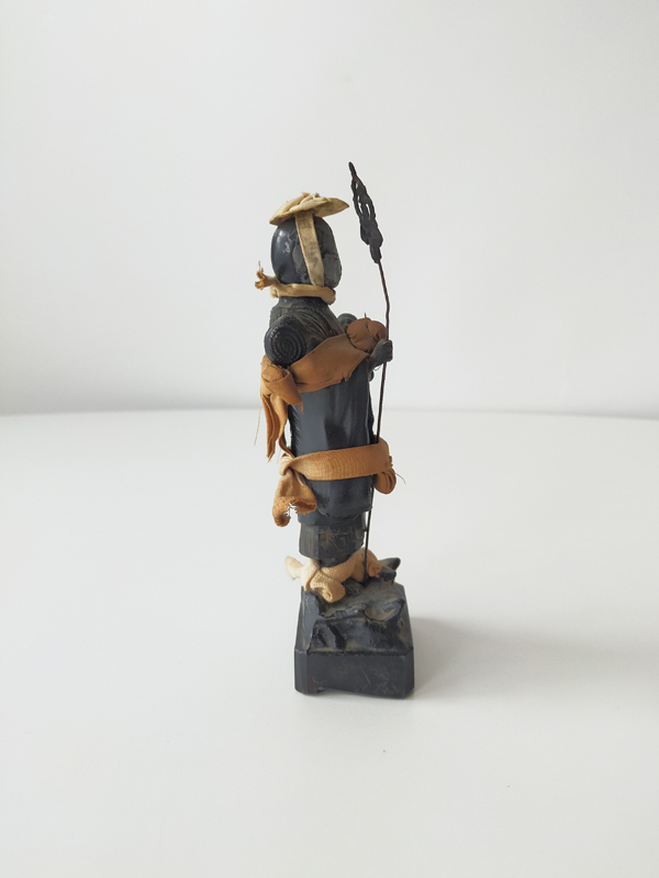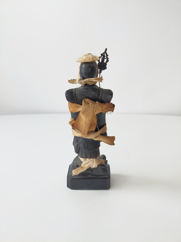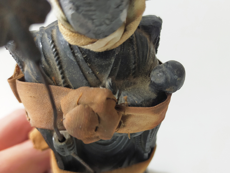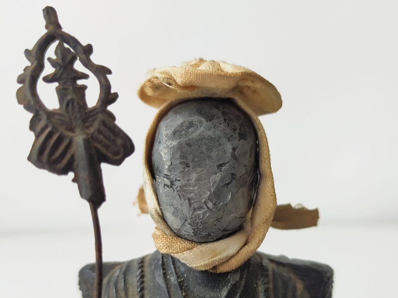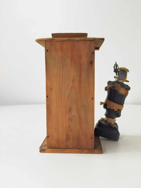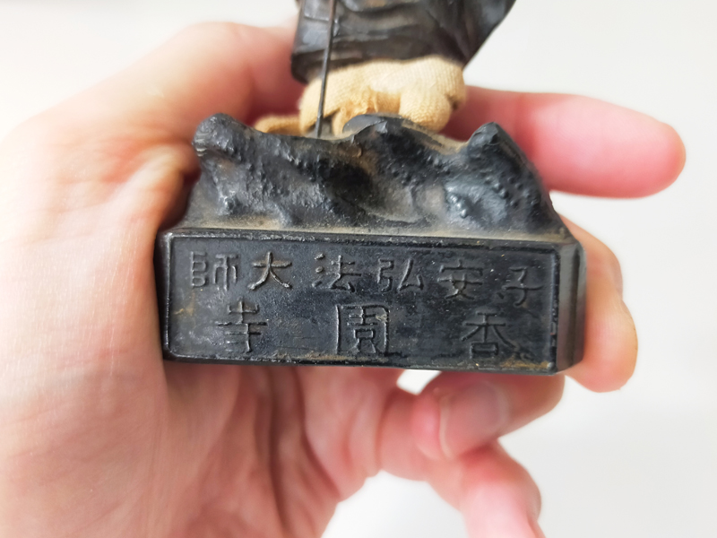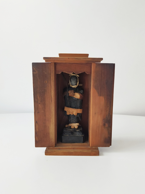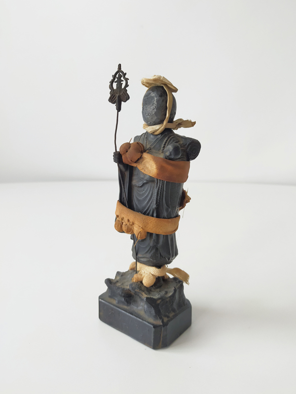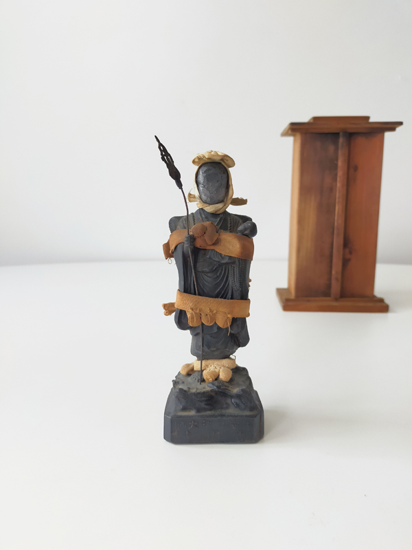 KOYASU KŌBŌ DAISHI (Dealer: titcoRet) – Metal alloy statue of Kōbō Daishi (Kūkai) known as Koyasu Daishi—the guardian of safe childbirth—enshrined at Kōon-ji Temple, the 61st temple on the Shikoku Pilgrimage. Japan, Shōwa period, 20th century. Housed in a small wooden zushi (portable shrine). Approx. shrine: H 21.3 × W 11.7 × D 8.7 cm (8.4 × 4.6 × 3.4 in); figure: H 15.8 cm (6.2 in, excluding staff). Face partially crushed or deformed, giving it an eerie presence. Natural age-related wear and patina.