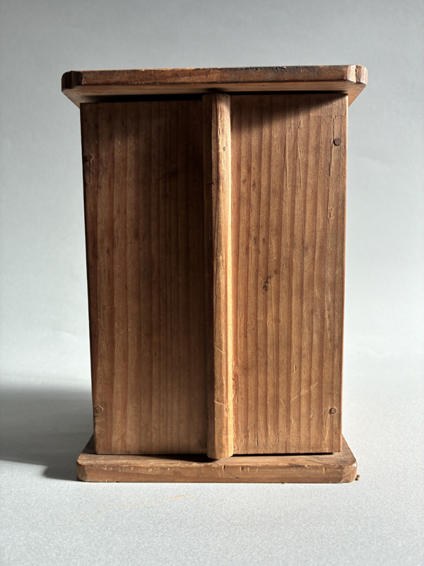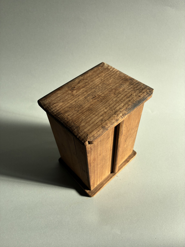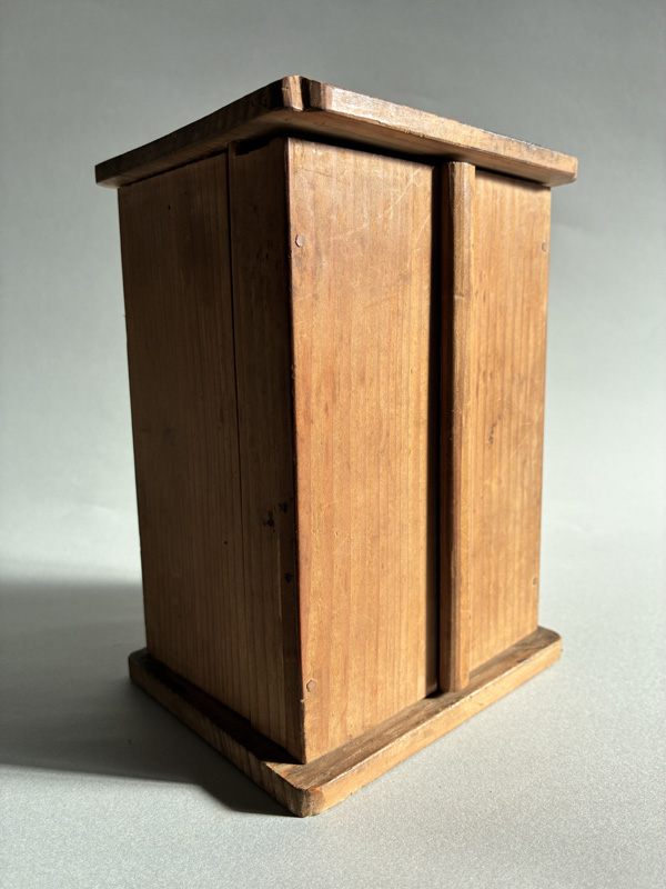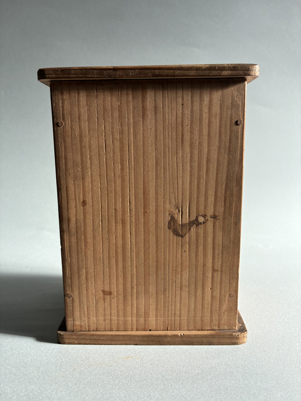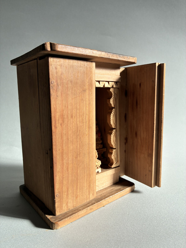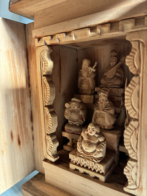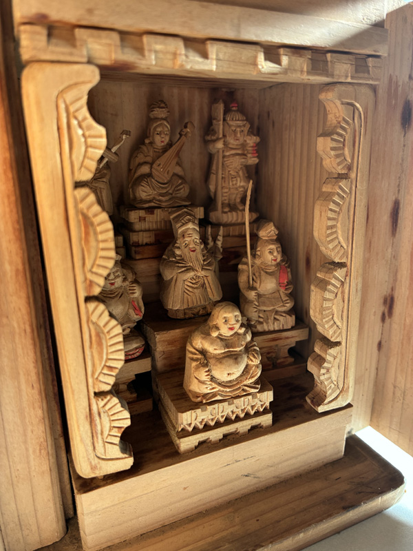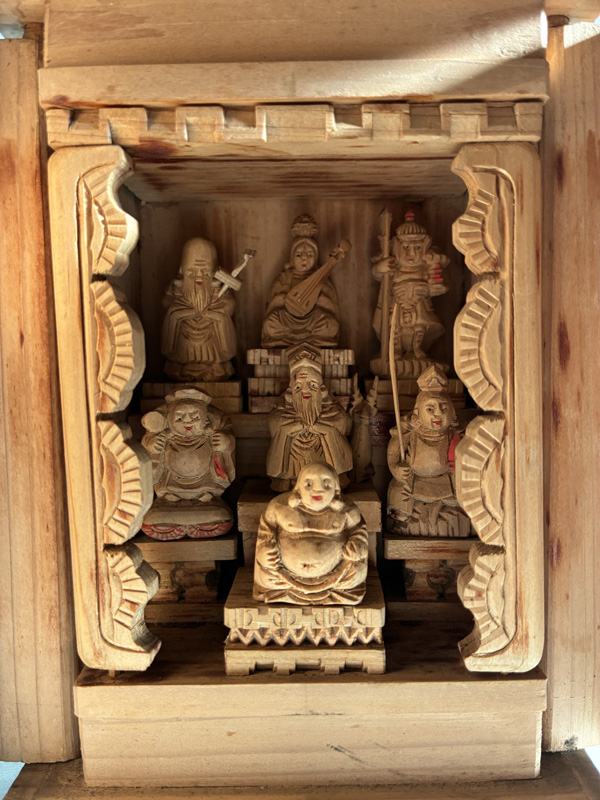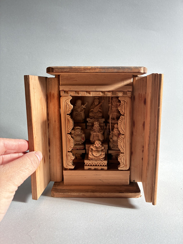 MINIATURE SEVEN LUCKY GODS (Dealer: Pottari) – Miniature wooden carvings depicting the Seven Lucky Gods (Shichifukujin) enshrined within a zushi shrine. Japan, Shōwa period (20th century). Approx. 16.5 × 10.5 × 10 cm (6.5 × 4.1 × 4.1 in). Each figure is carefully hand-carved and hand-painted, with individually rendered facial expressions. No notable chips or losses observed. Age-related wear consistent with time, as seen.