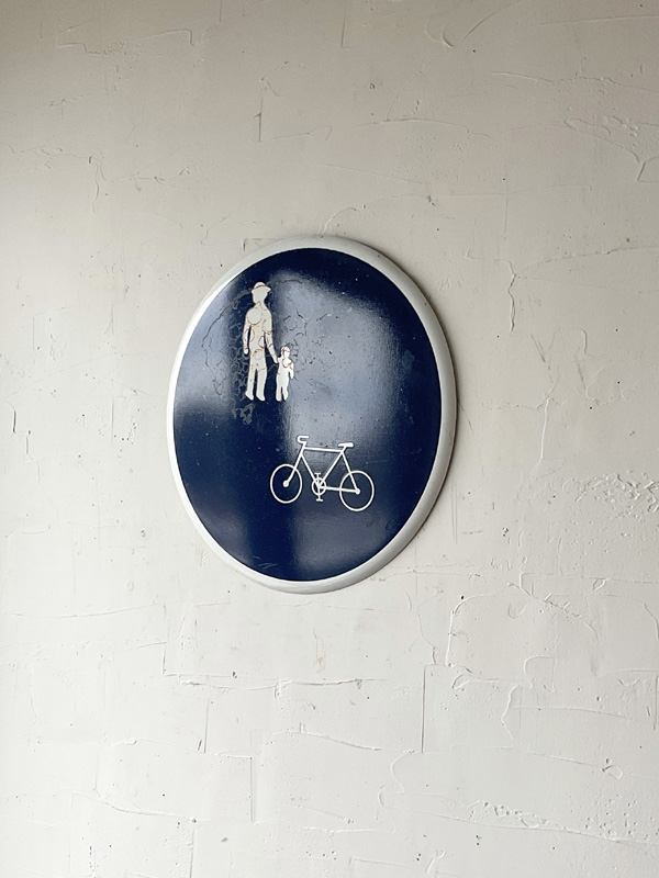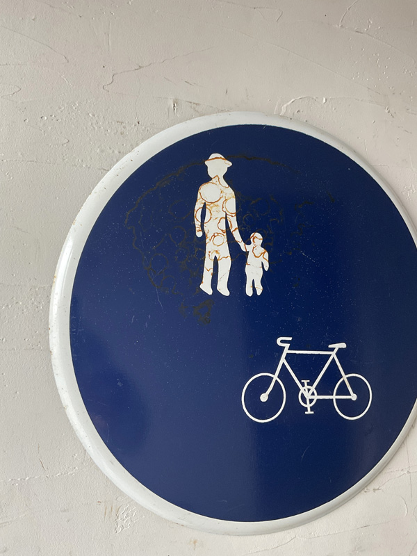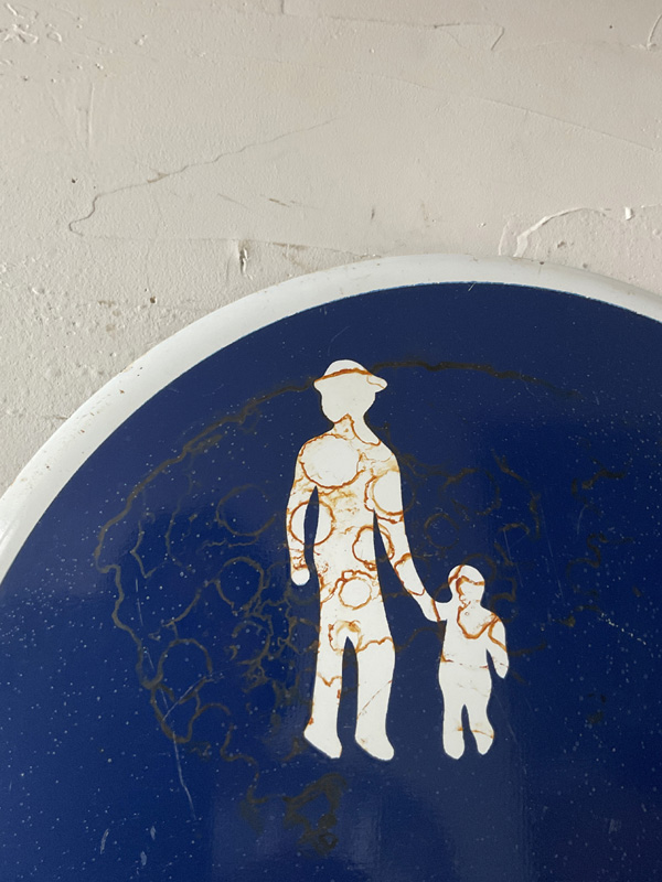 BICYCLES AND PEDESTRIANS ONLY (Dealer: hotoke) – Japanese road sign for a bicycle and pedestrian–only path. Heisei period (early 21st century). Aluminum. Approx. 29.8 cm (11.7 in) in diameter and 0.5 cm (0.2 in) thick. Unique age-related wear and stains, as is.