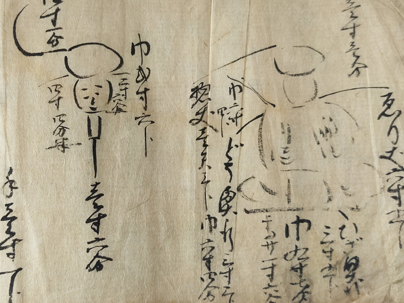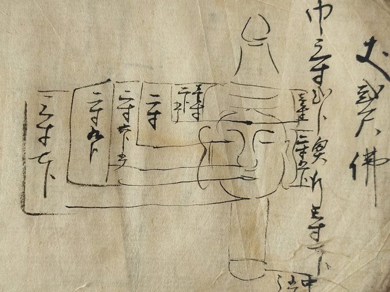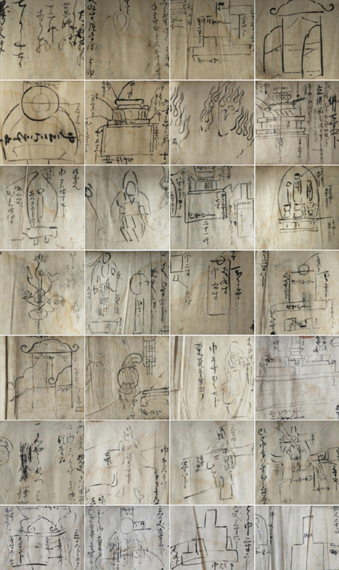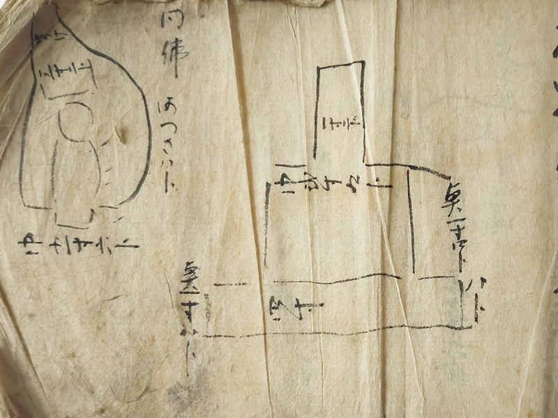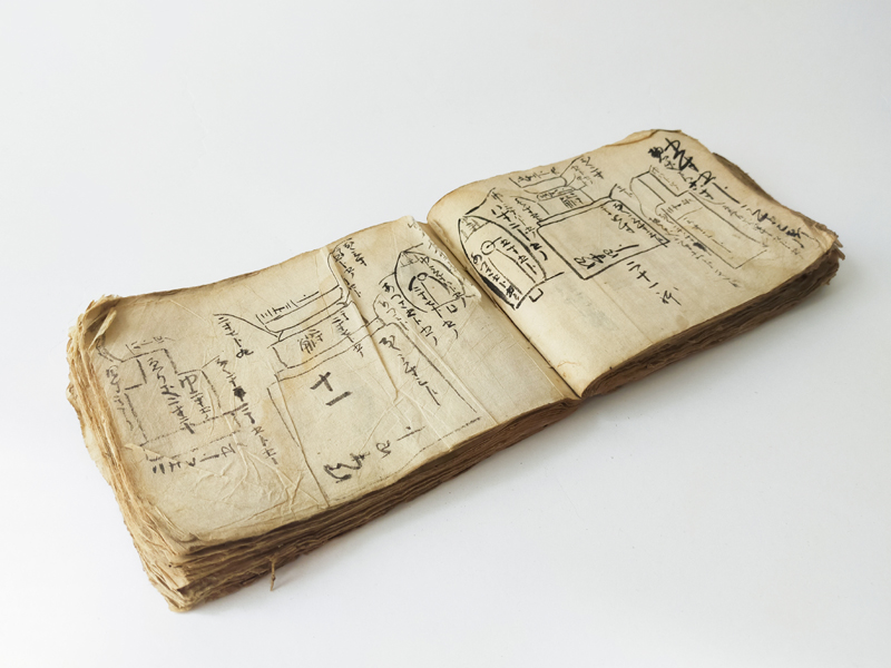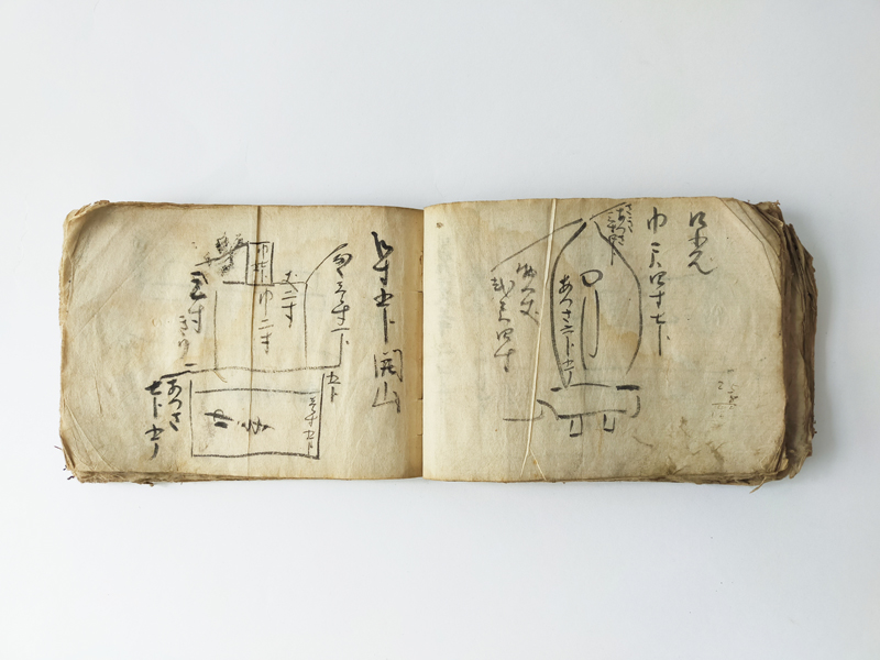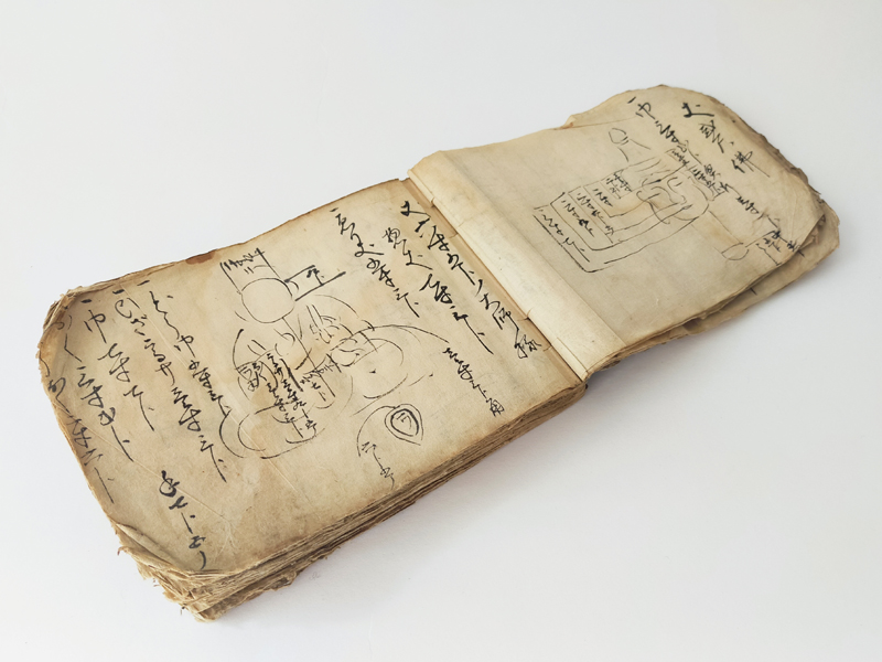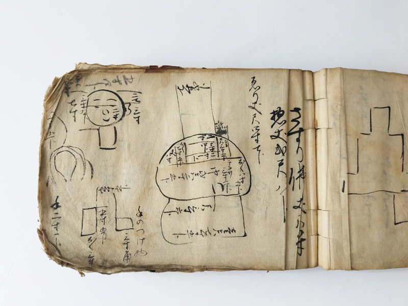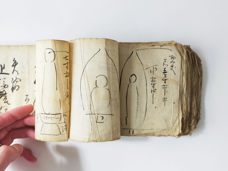 RECORD BOOK OF GRAVESTONE AND STATUE MEASUREMENTS (Dealer: titcoRet) – A hand-drawn record book from the Edo period (17th–19th century), created by a Japanese Buddhist sculptor (busshi) to document the dimensions of gravestones and Buddhist statues across various temples in Japan. Ink on paper. Over 90 pages filled with meticulous drawings and measurements. Approx. 17 × 12.5 × 3 cm (6.7 × 4.9 × 1.2 in). Natural wear and patina consistent with age.
