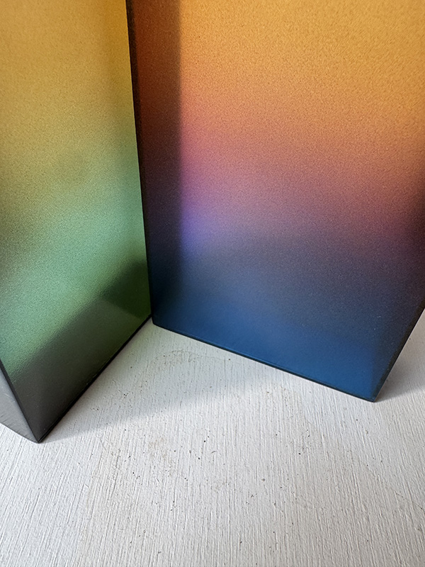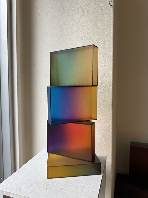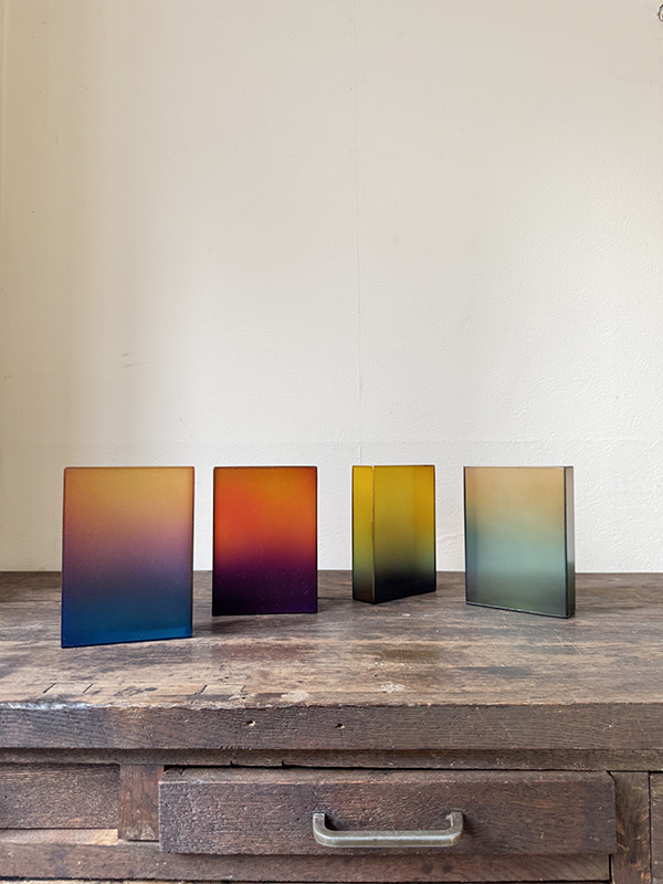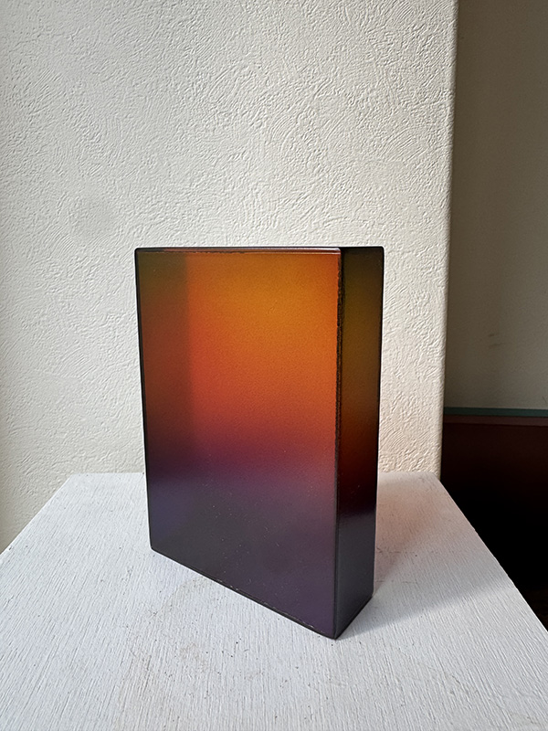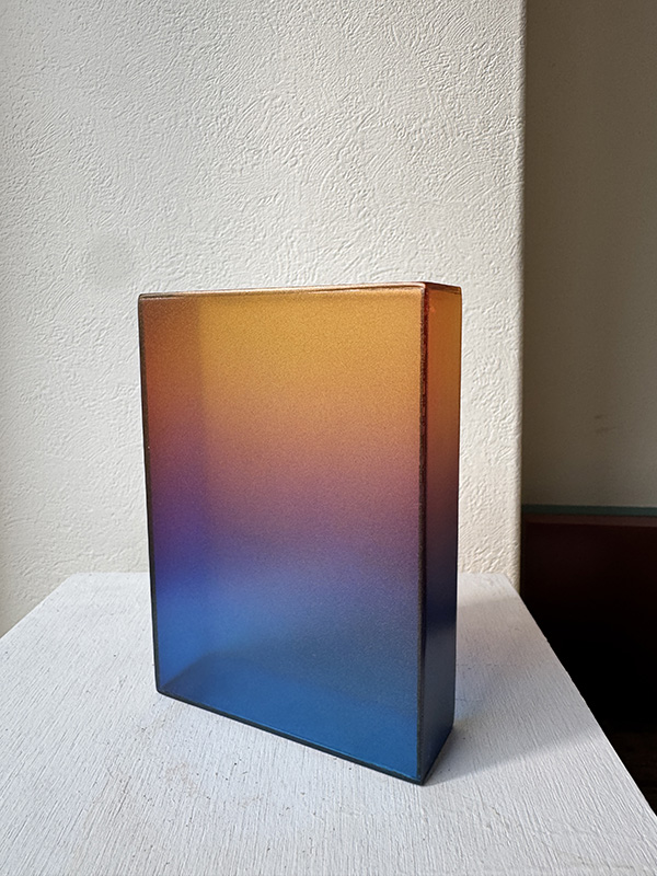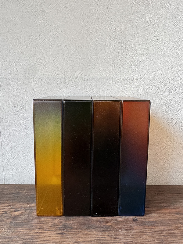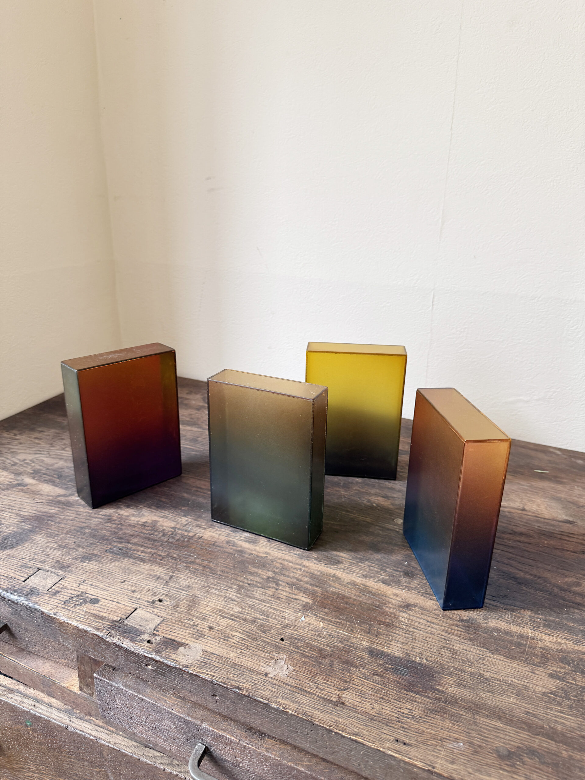 CRAFTSMAN’S COLOR SAMPLE BOXES (Dealer: Jinta) – Set of four contemporary experimental color objects made by a Japanese frame-making craftsman using leftover acrylic materials. Each approx. 14.5 × 10.5 × 3.5 cm (5.7 × 4.1 × 1.4 in). Each box features a hand-sprayed gradient of 6–8 colors, applied with a spray gun through repeated trial and adjustment. When placed near a window or in natural light, the layered colors reveal a vivid yet subtle beauty. Condition as shown.