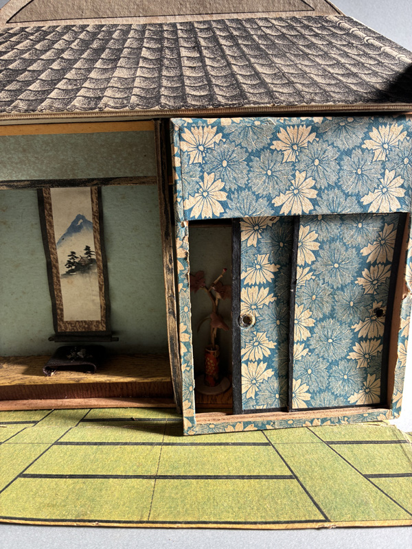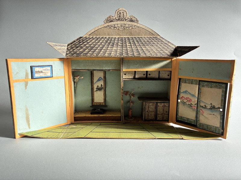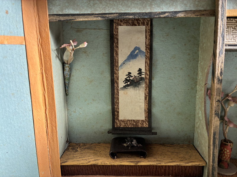 MINIATURE SEVEN LUCKY GODS (Dealer: Pottari) – Miniature wooden carvings depicting the Seven Lucky Gods (Shichifukujin) enshrined within a zushi shrine. Japan, Shōwa period (20th century). Approx. 16.5 × 10.5 × 10 cm (6.5 × 4.1 × 4.1 in). Each figure is carefully hand-carved and hand-painted, with individually rendered facial expressions. No notable chips or losses observed. Age-related wear consistent with time, as seen.