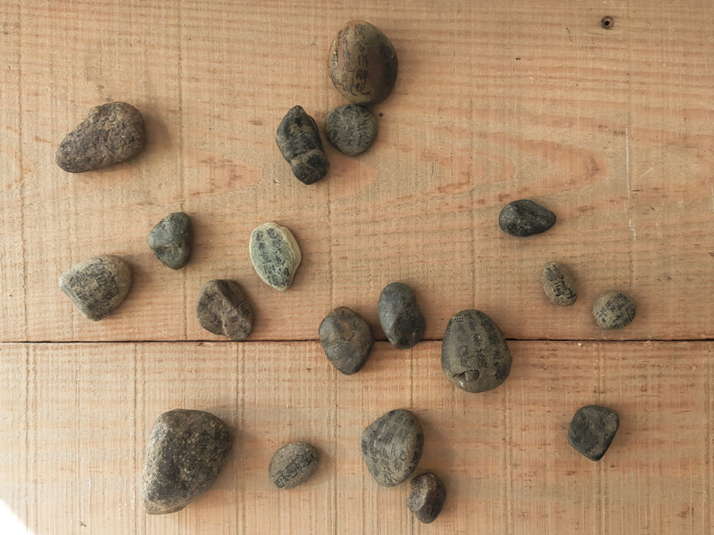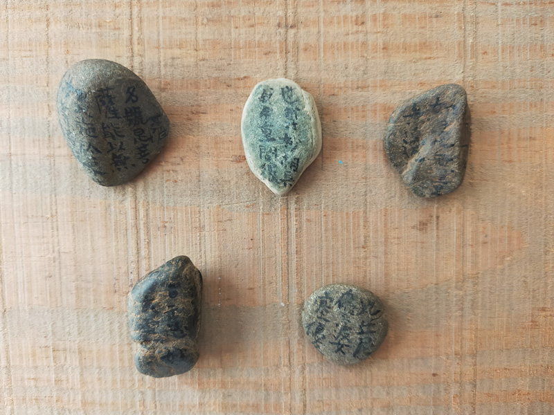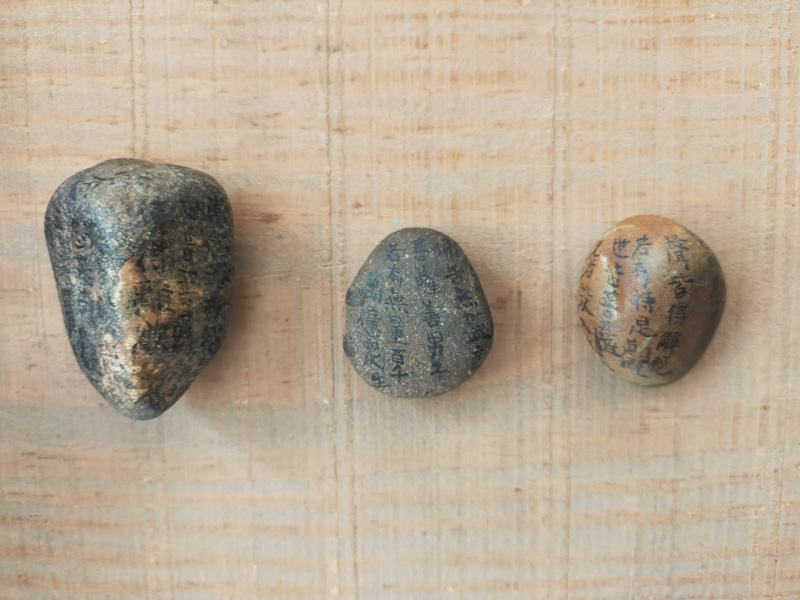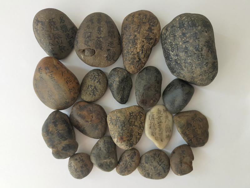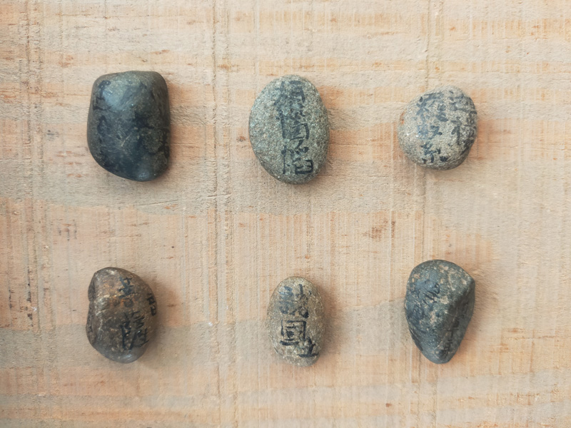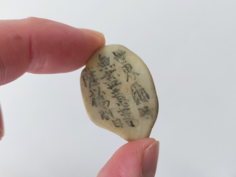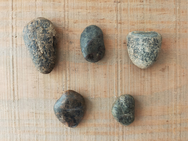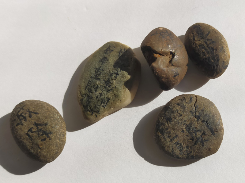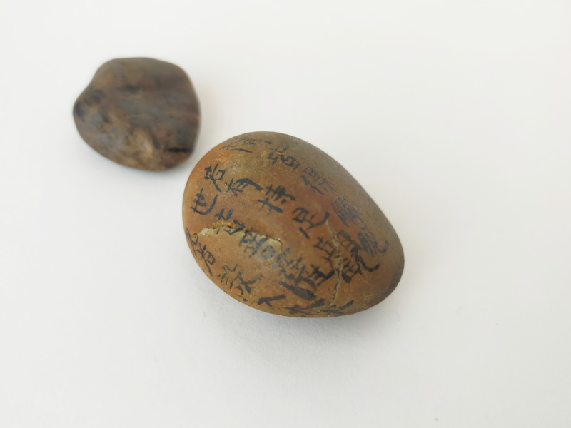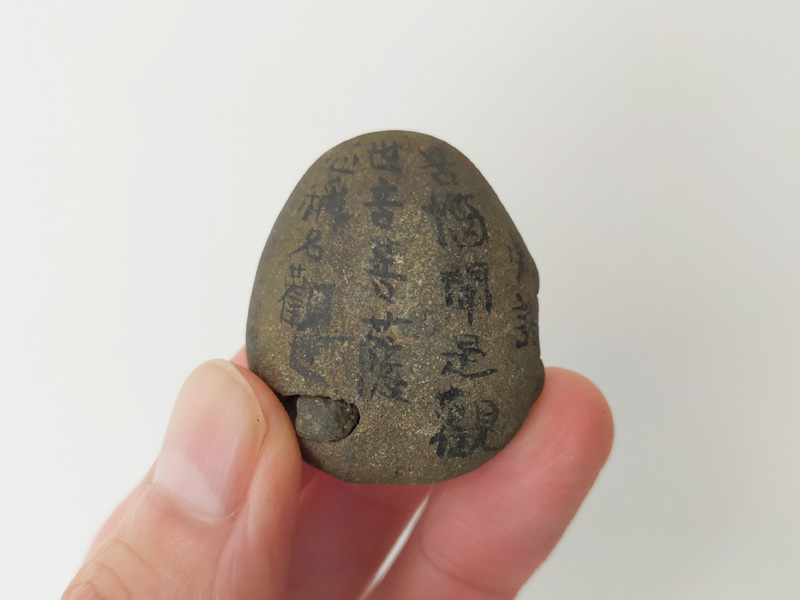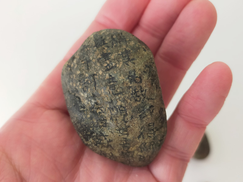 INSCRIBED SUTRA STONES (Dealer: titcoRet) – Set of inscribed river stones known as Taji Issekikyō, created for memorial rites and prayers for the living. Each stone bears hand-written Buddhist sutra text—here, passages from the Lotus Sutra—originally written in ink and buried in the ground as an act of devotion. Japan, Edo period (17th–19th century). Largest stone approx. 5 × 3.5 × 3 cm (2 × 1.4 × 1.2 in). Some abrasion, fading, and partial loss of inscription, with traces of soil remaining due to burial and later excavation.