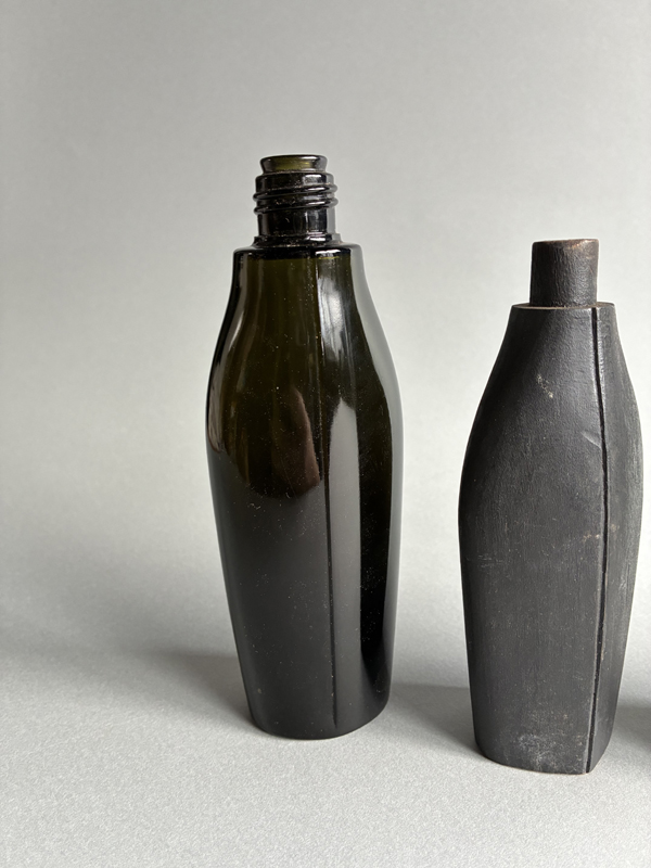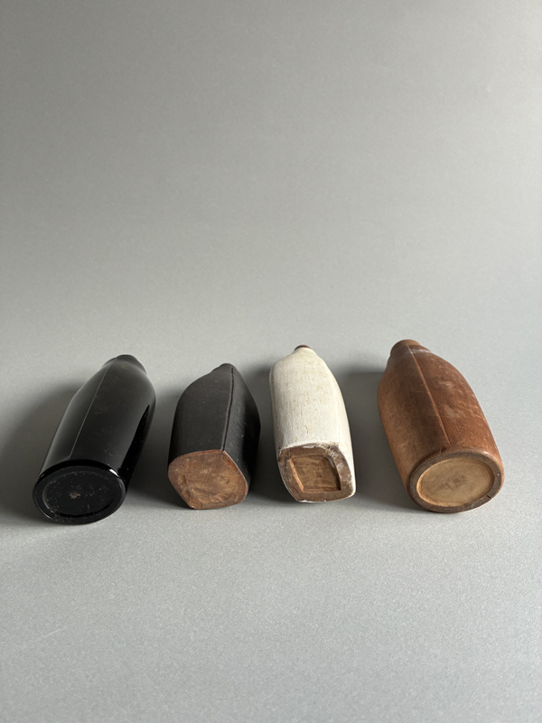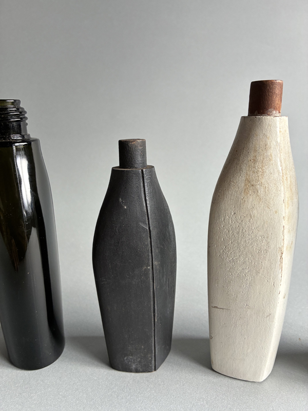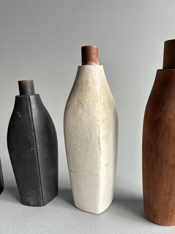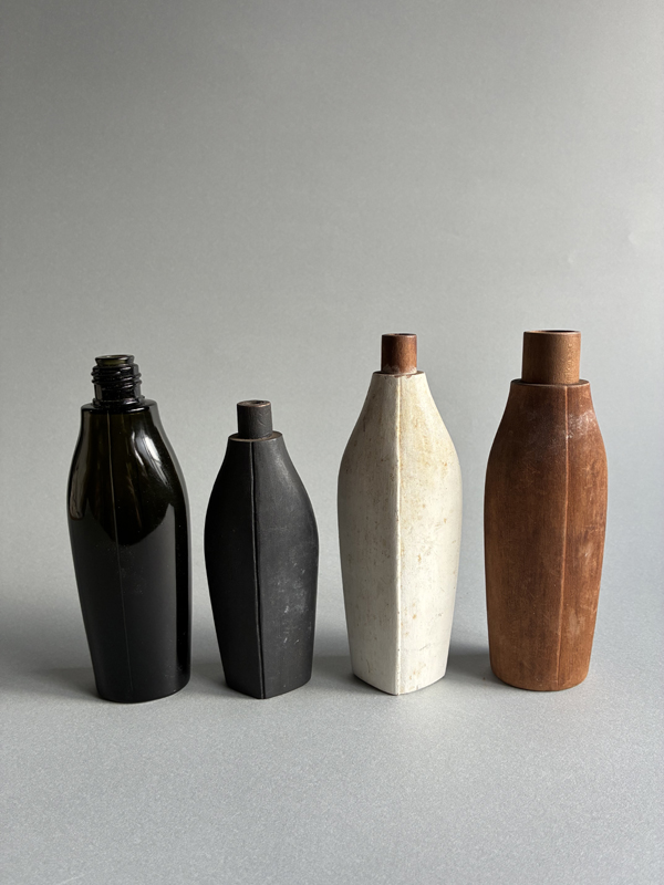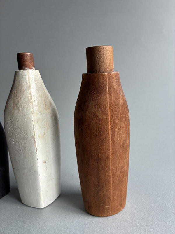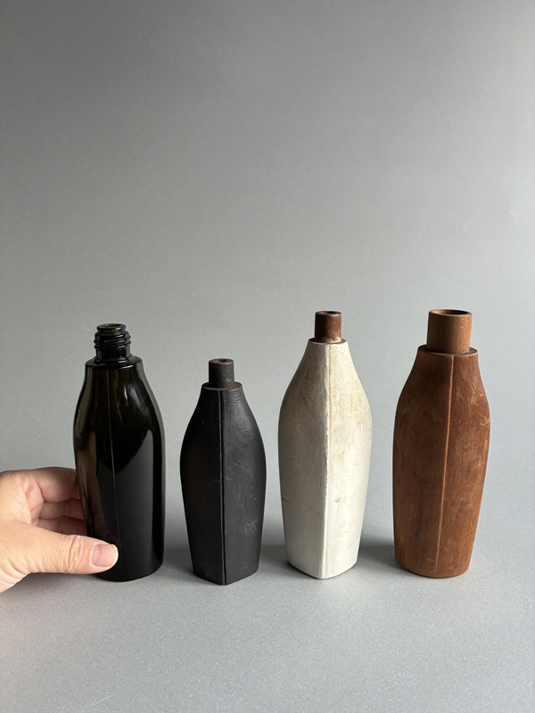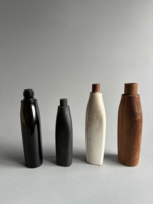 COSMETIC BOTTLE PROTOTYPES (Dealer: Pottari) – Set of four old prototypes for cosmetic bottles, including both wood and glass types. Japan, Shōwa period (20th century). Approx. max. 16.5 × 6 × 3.5 cm (6.5 × 2.4 × 1.4 in). No chips or losses.