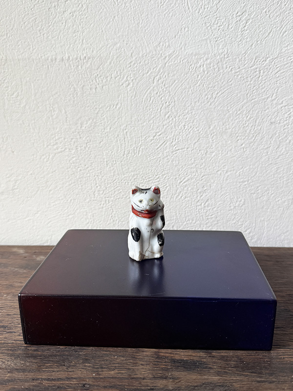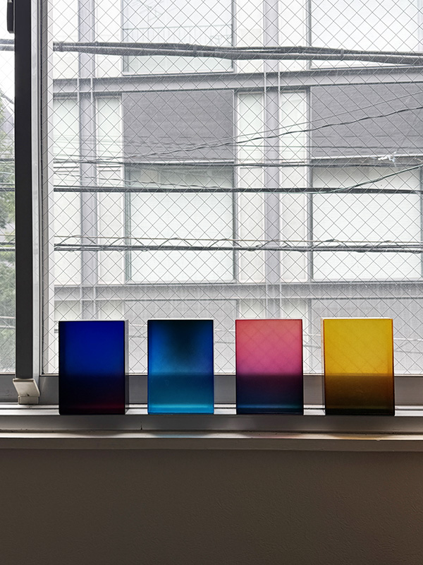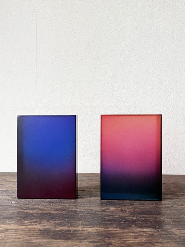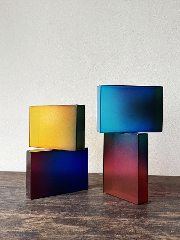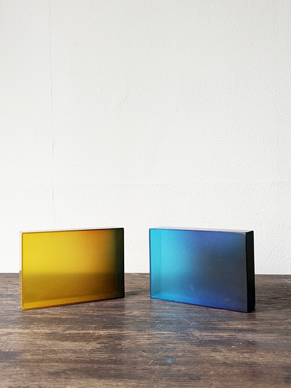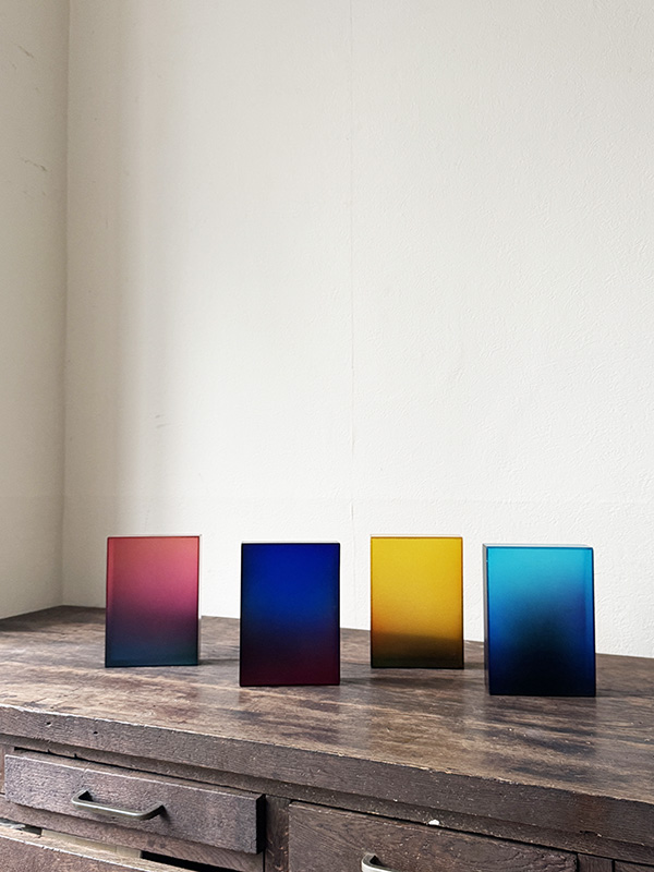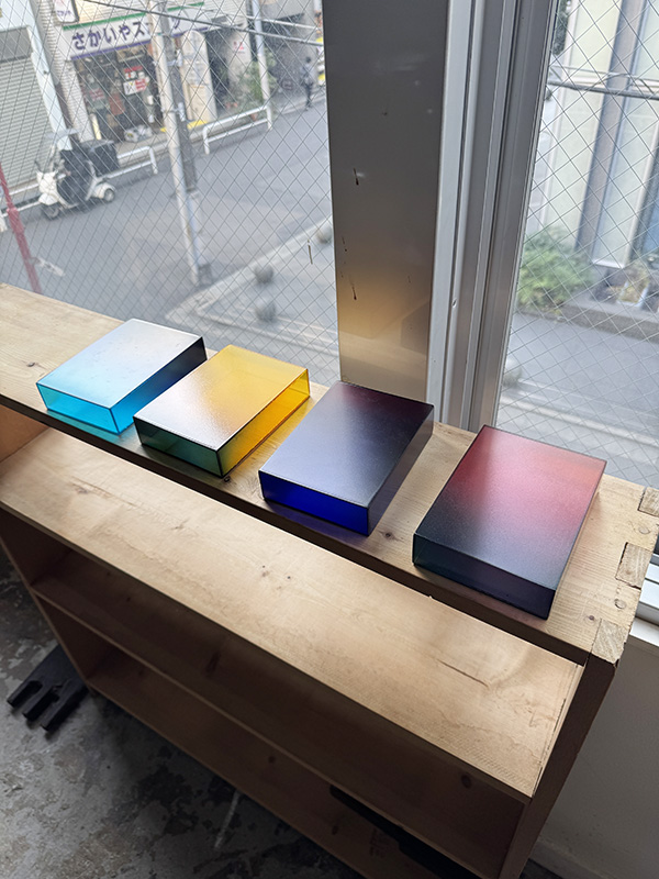 CRAFTSMAN’S COLOR SAMPLE BOXES (Dealer: Jinta) – Set of four contemporary experimental color objects made by a Japanese frame-making craftsman using leftover acrylic materials. Each approx. 14.5 × 10.5 × 3.5 cm (5.7 × 4.1 × 1.4 in). Each box features a hand-sprayed gradient of 6–8 colors, applied with a spray gun through repeated trial and adjustment. When placed near a window or in natural light, the layered colors reveal a vivid yet subtle beauty. Condition as shown. *Beckoning cat not included.
