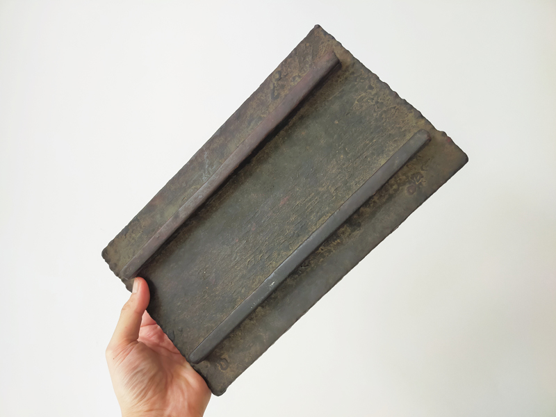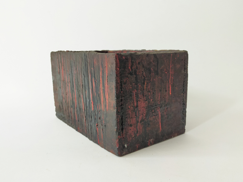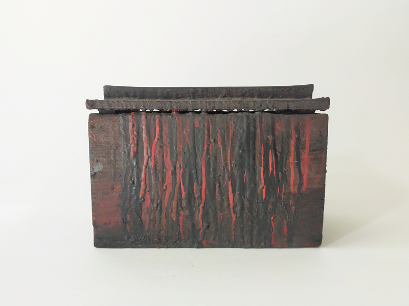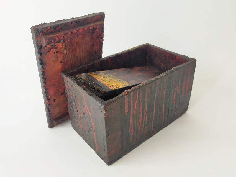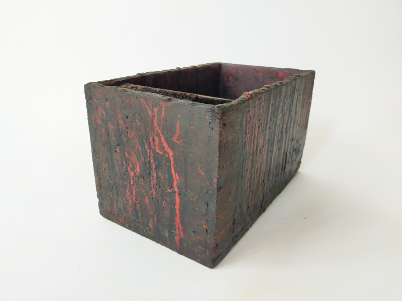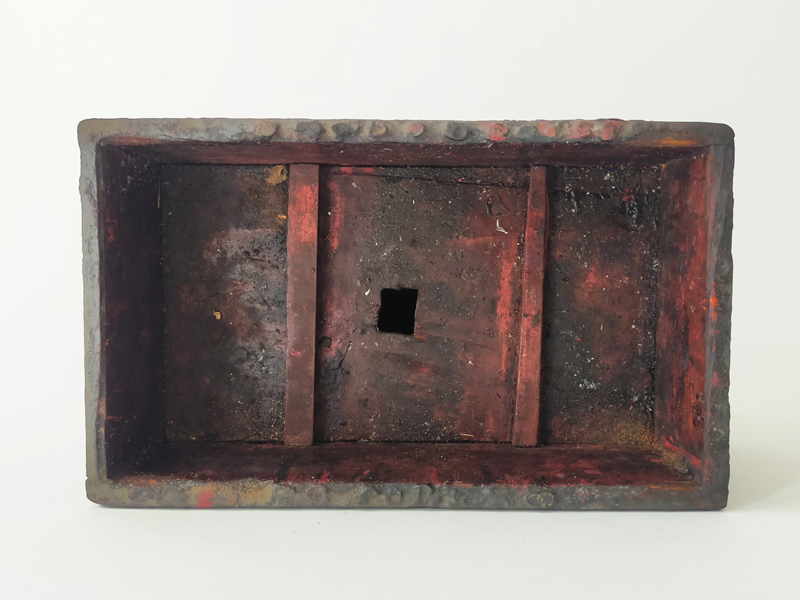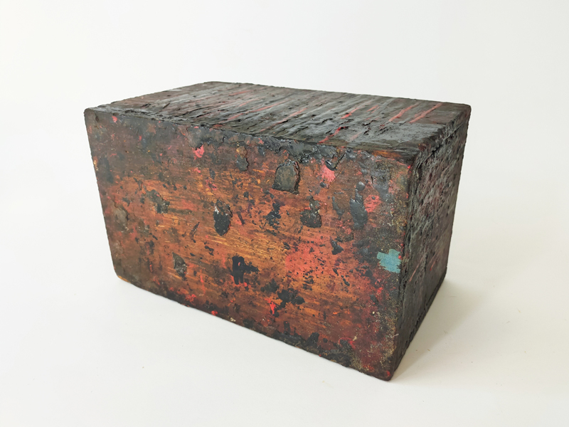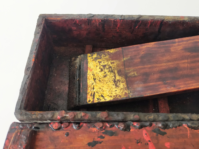 LACQUERER’S TOOL BOX (Dealer: titcoRet) – Wooden toolbox once used by a Japanese lacquer craftsman. Meiji period (1868-1912). Approx. 27.8 × 16.9 × 19.8 cm (10.9 × 6.7 × 7.8 in). Includes a large wooden spatula stored inside. A removable inner divider board remains fixed in place, likely due to hardened lacquer.