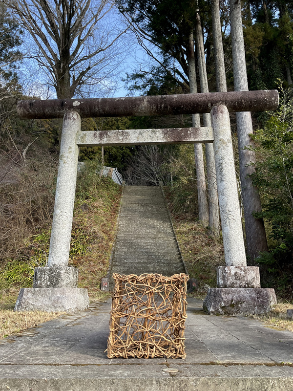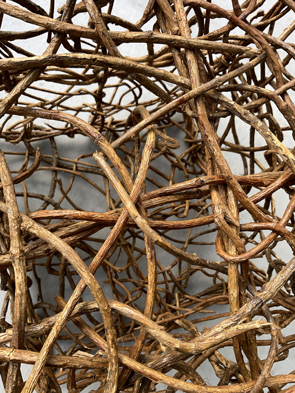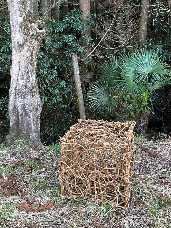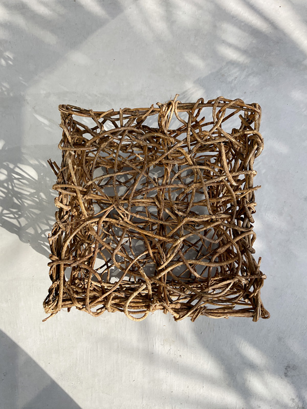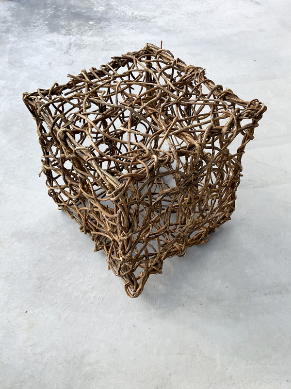 VINE CUBE (Dealer: hotoke) – A geometric cube formed from woven organic vine. Japan, Shōwa period (20th century). Each side approx. 46–49 cm (18.1–19.3 in). Age-related wear consistent with time.