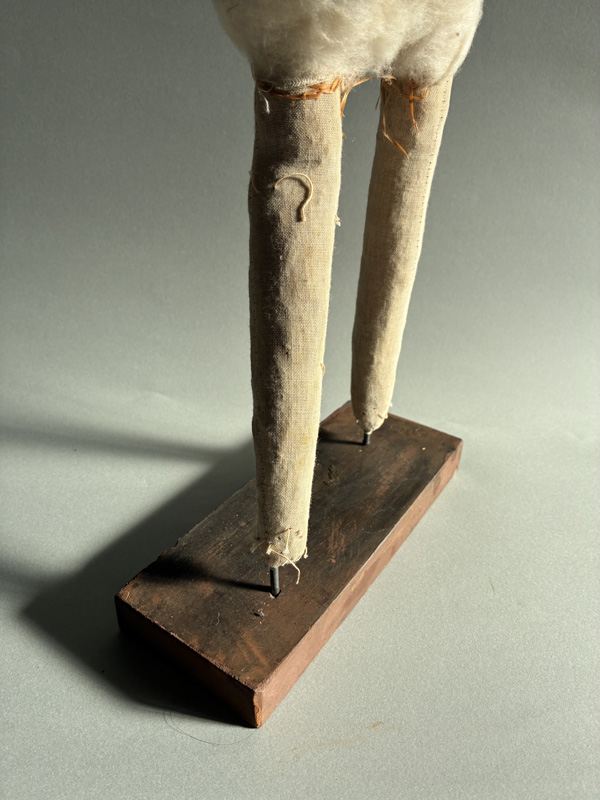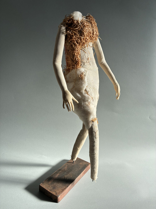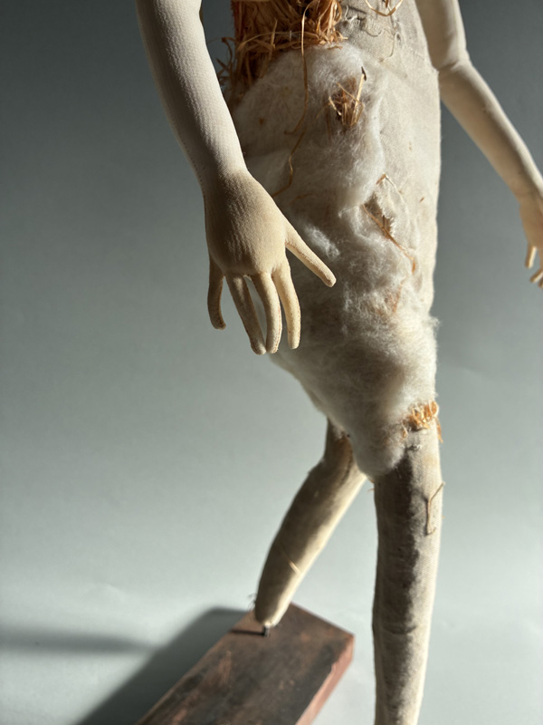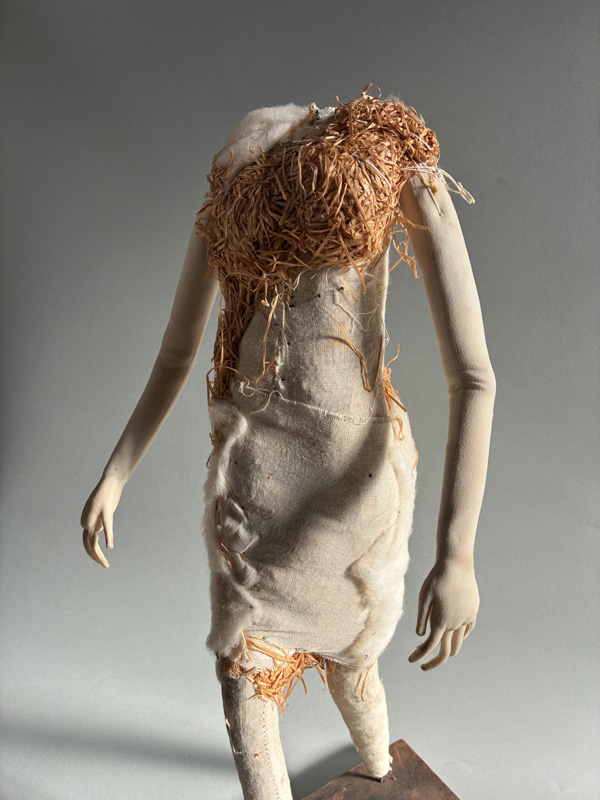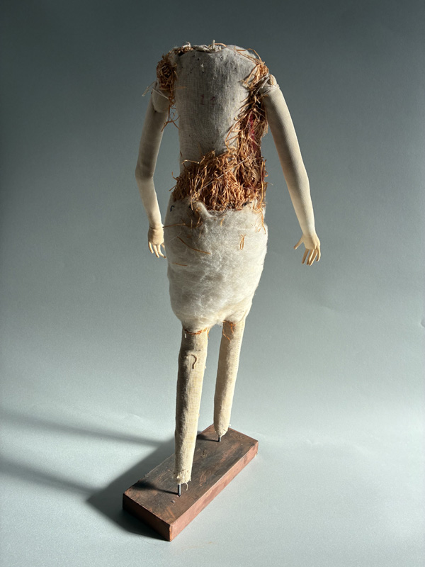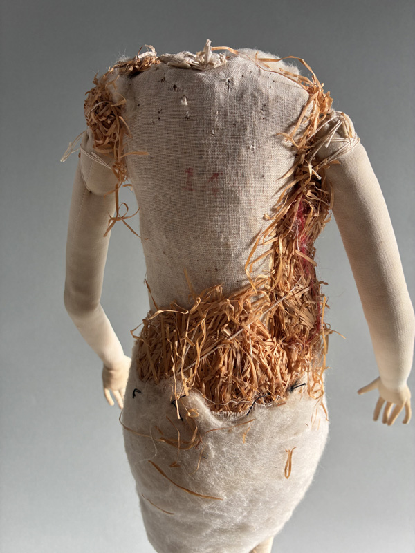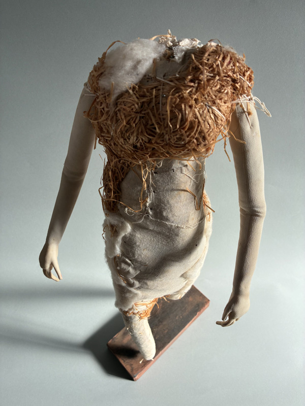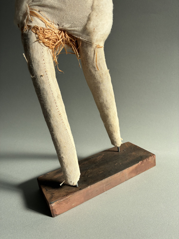 JAPANESE DOLL (Dealer: Pottari) – Crafted from cloth, straw, and wire, set on a stone base. Shōwa period (20th century). Approx. 48 × 20 × 18 cm (18.9 × 7.9 × 7.1 in). Condition as shown, with age-related wear consistent with time.