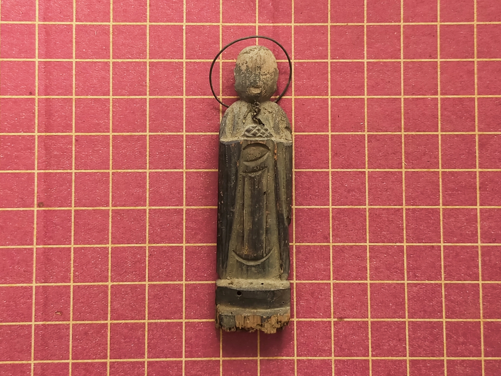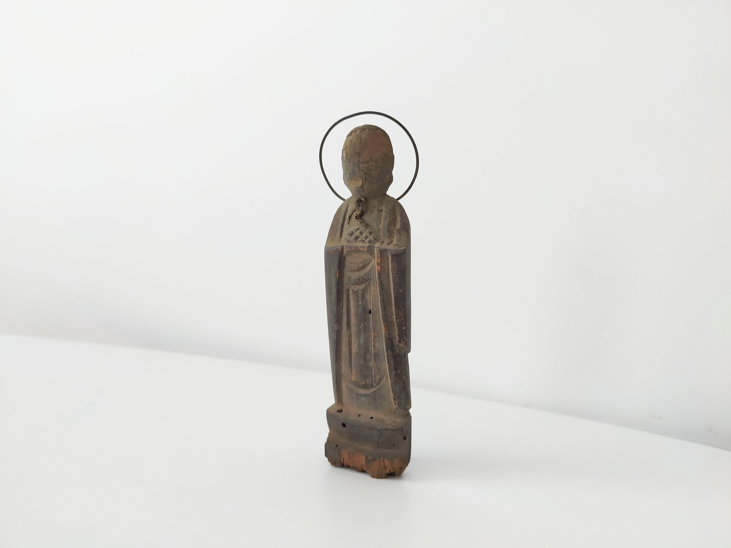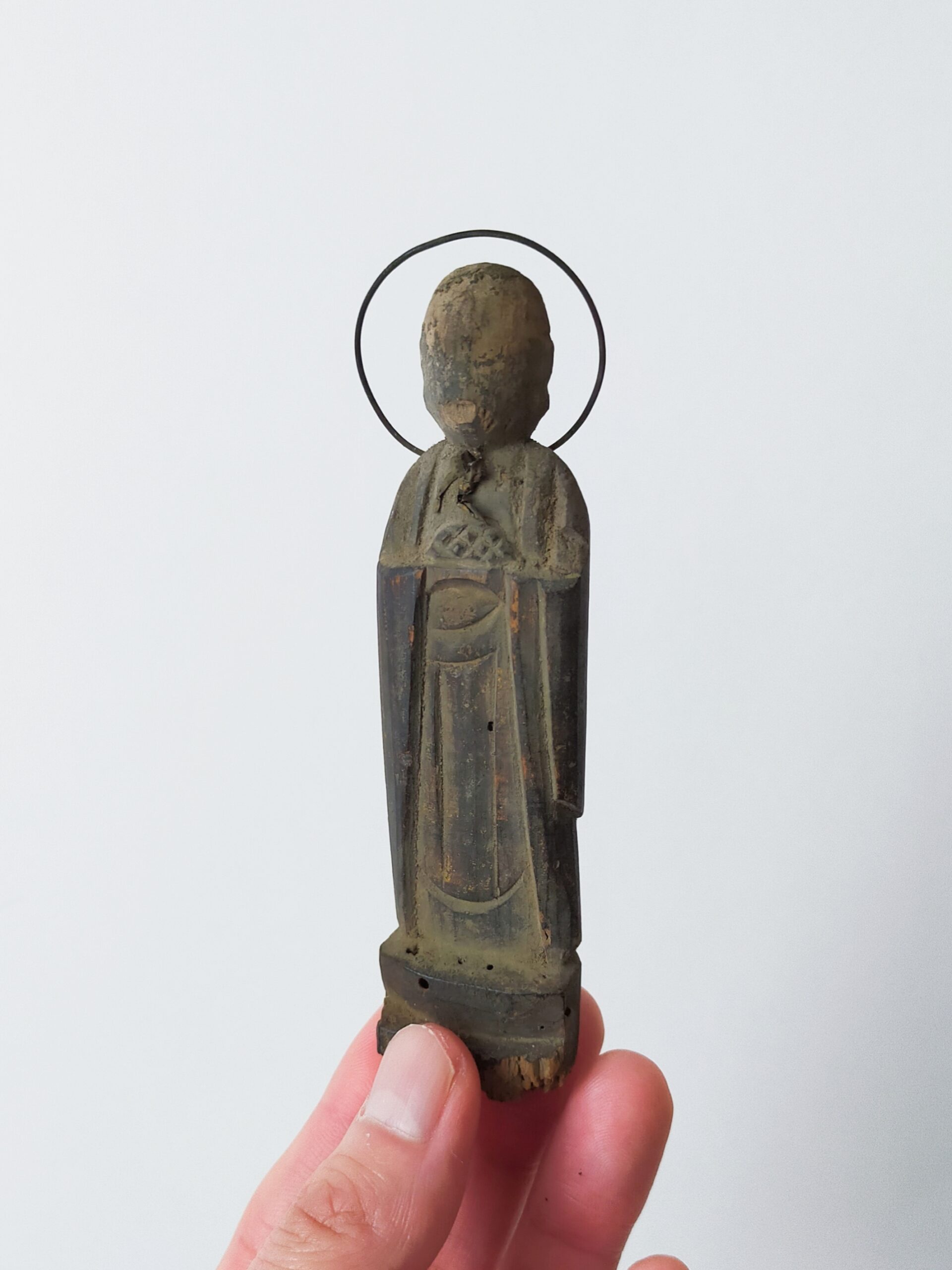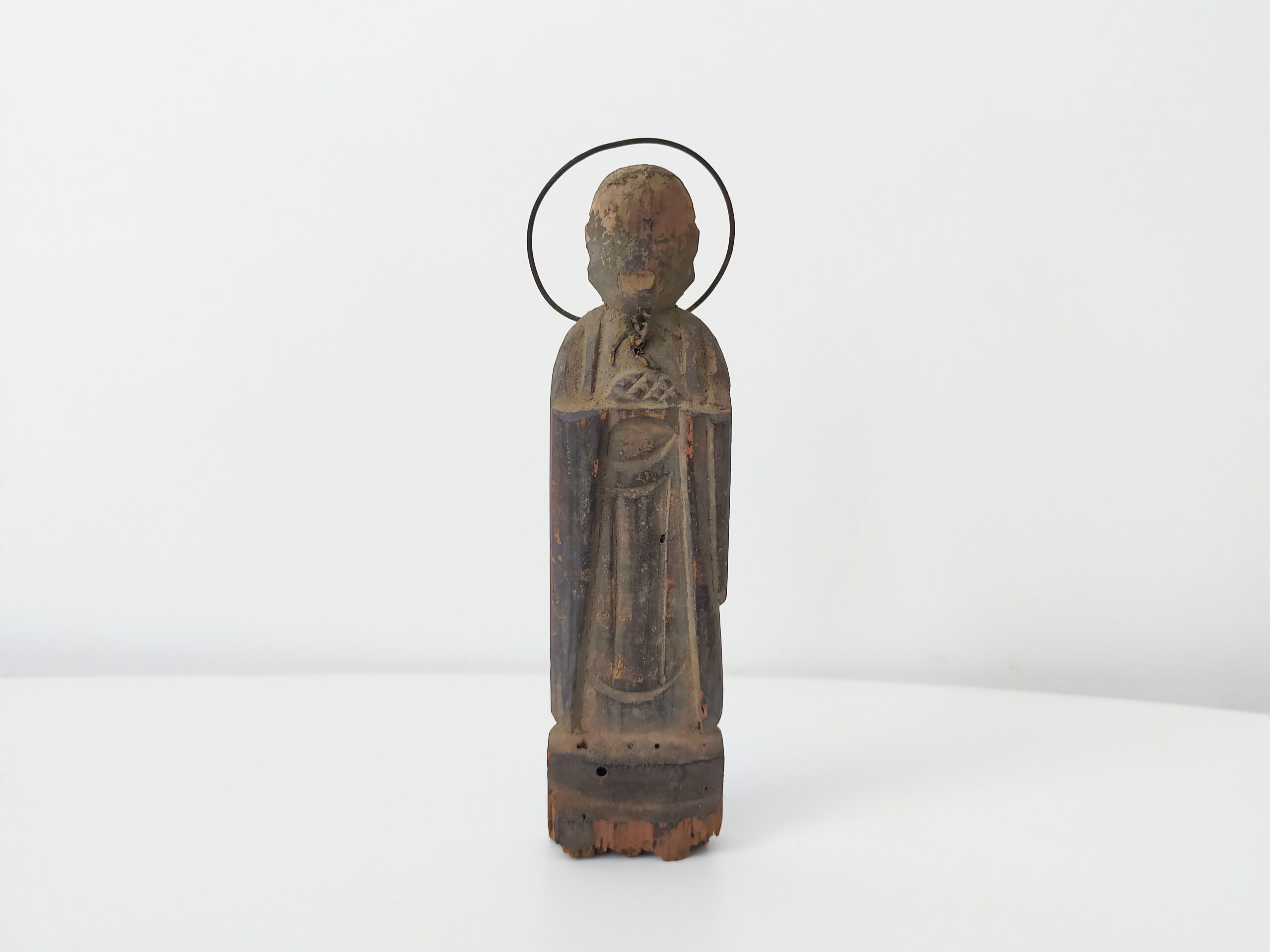 SENTAIBUTSU (Dealer: titcoRet) – A small wooden Jizō figure characterized by its simplified form and modest halo originated from a group of so-called Sentaibutsu (lit. “Thousand Buddhas”), large votive assemblages of similar devotional images dedicated in great numbers. Japan, Edo to Meiji period (19th century). Approx. 11 cm in height (4.3 in). Stands independently but is somewhat unstable. Evidence of age-related wear is present, including minor wormholes at the bottom with slight powder shedding. Condition as shown.