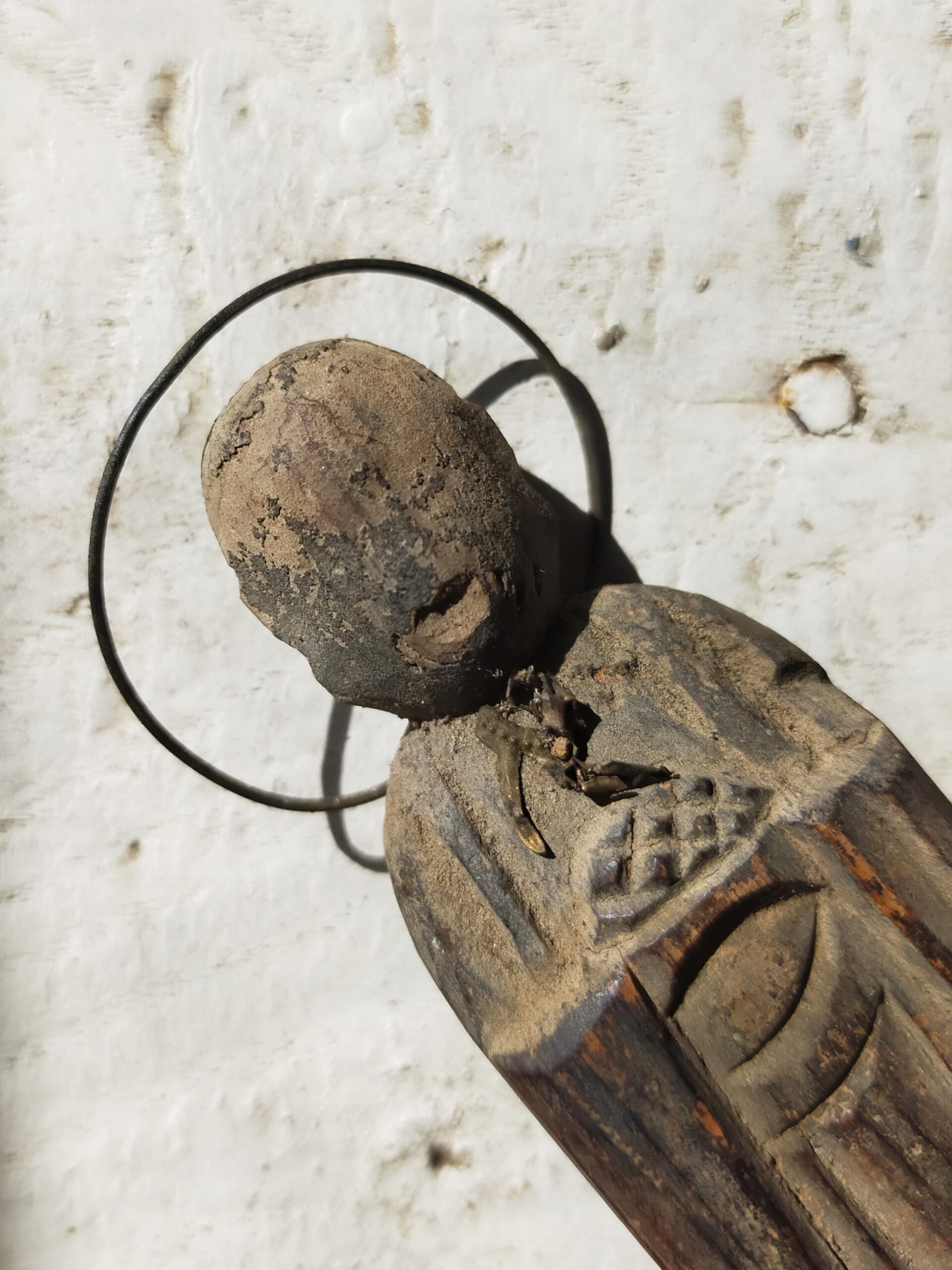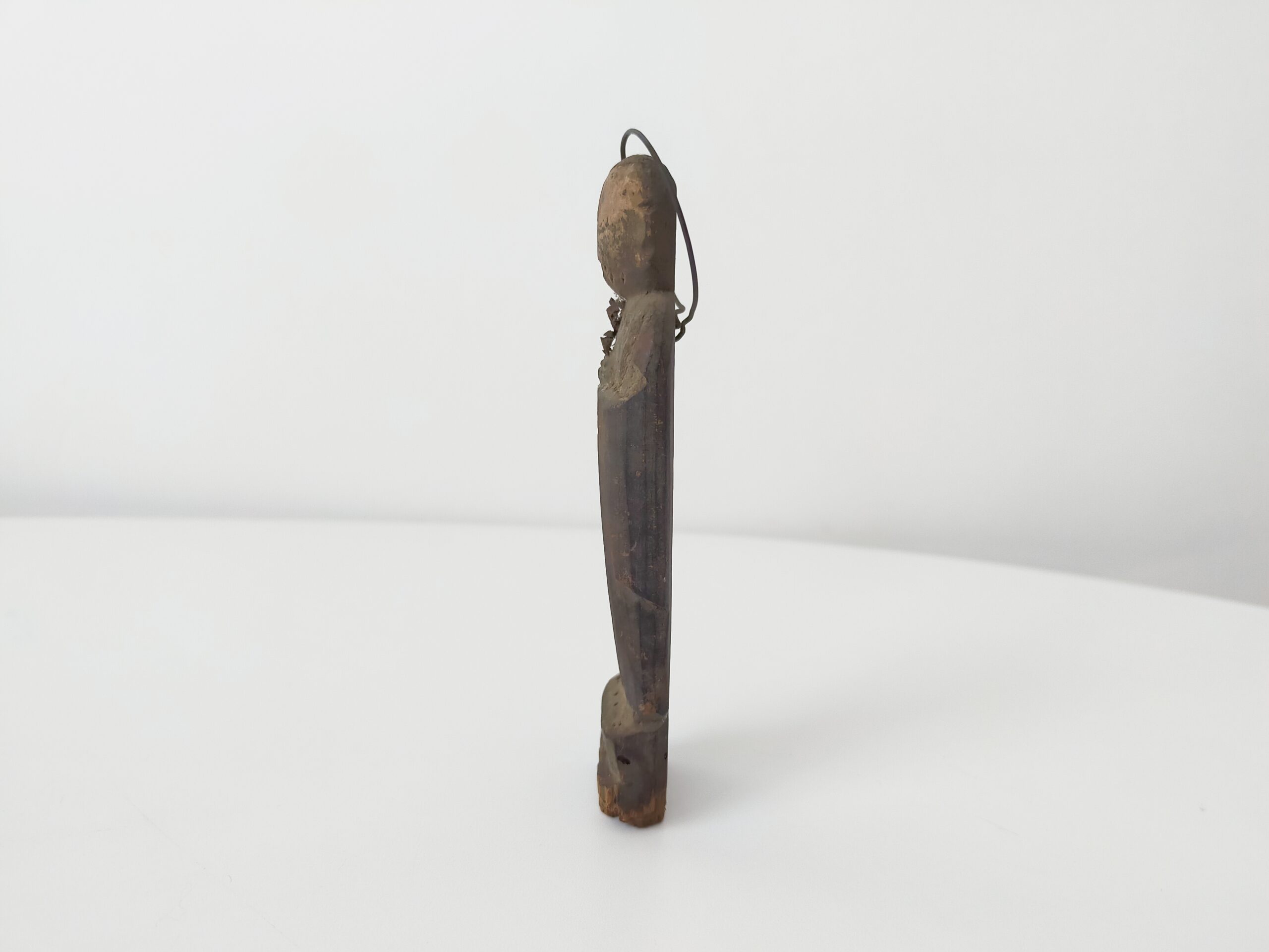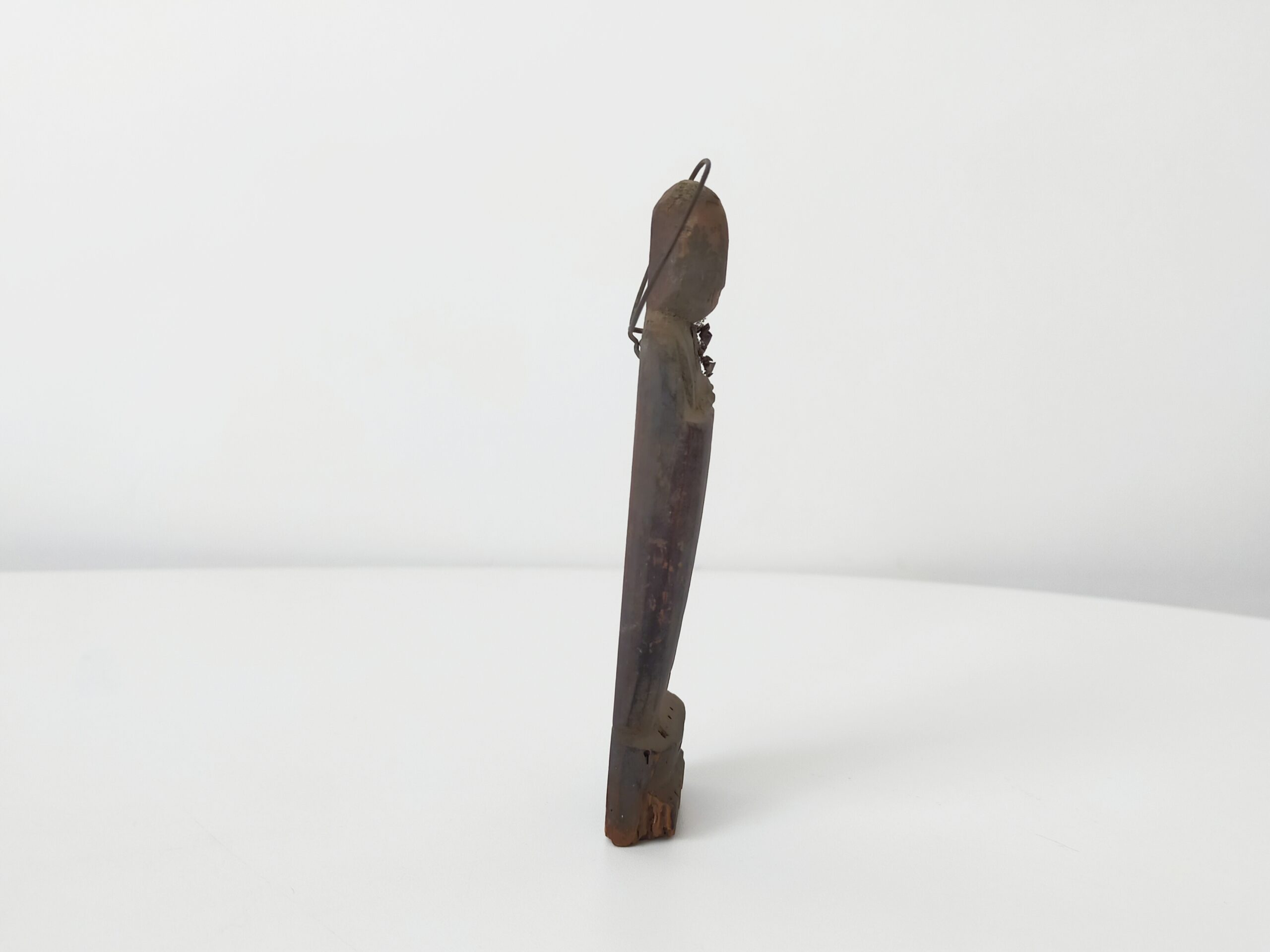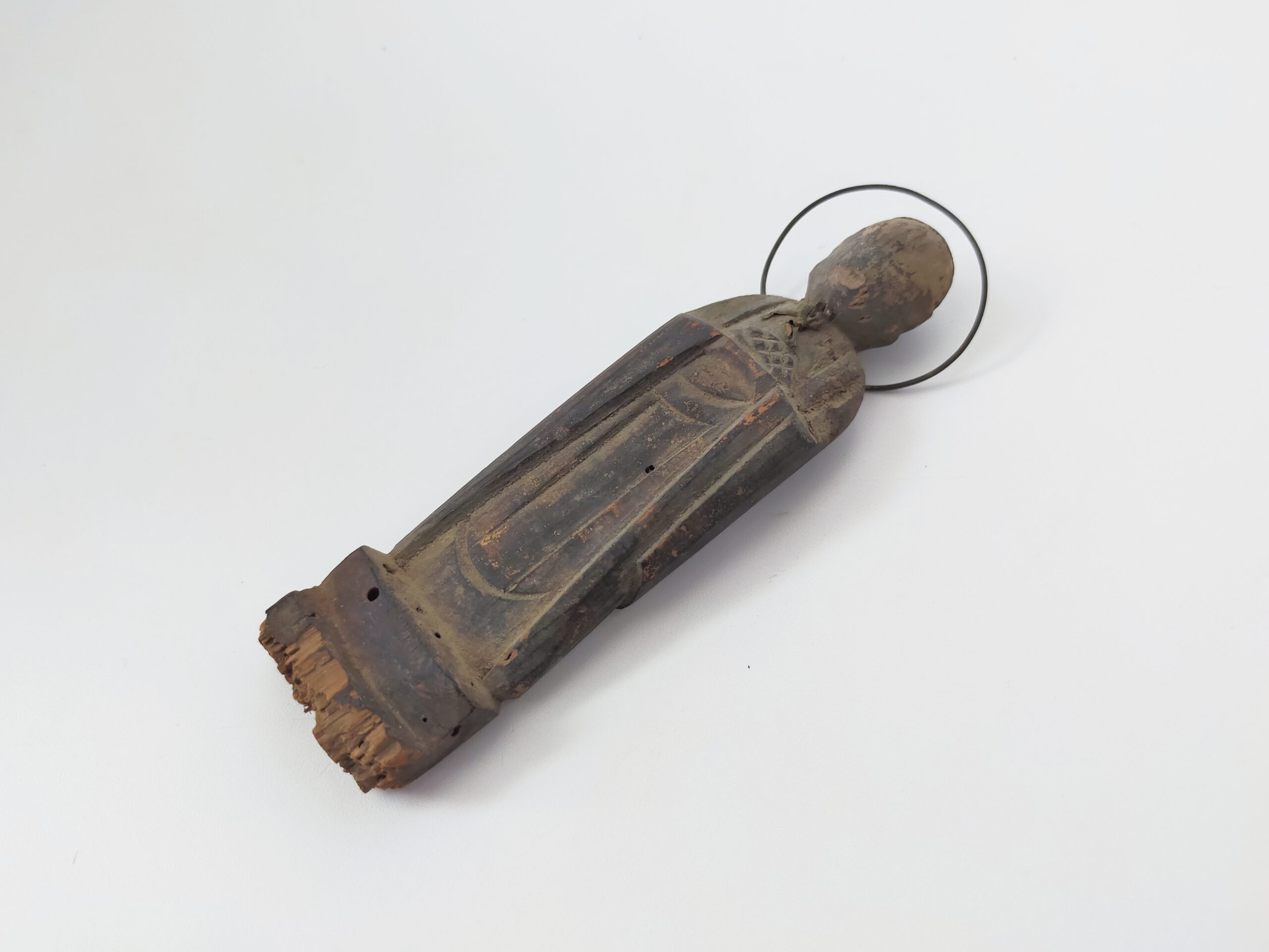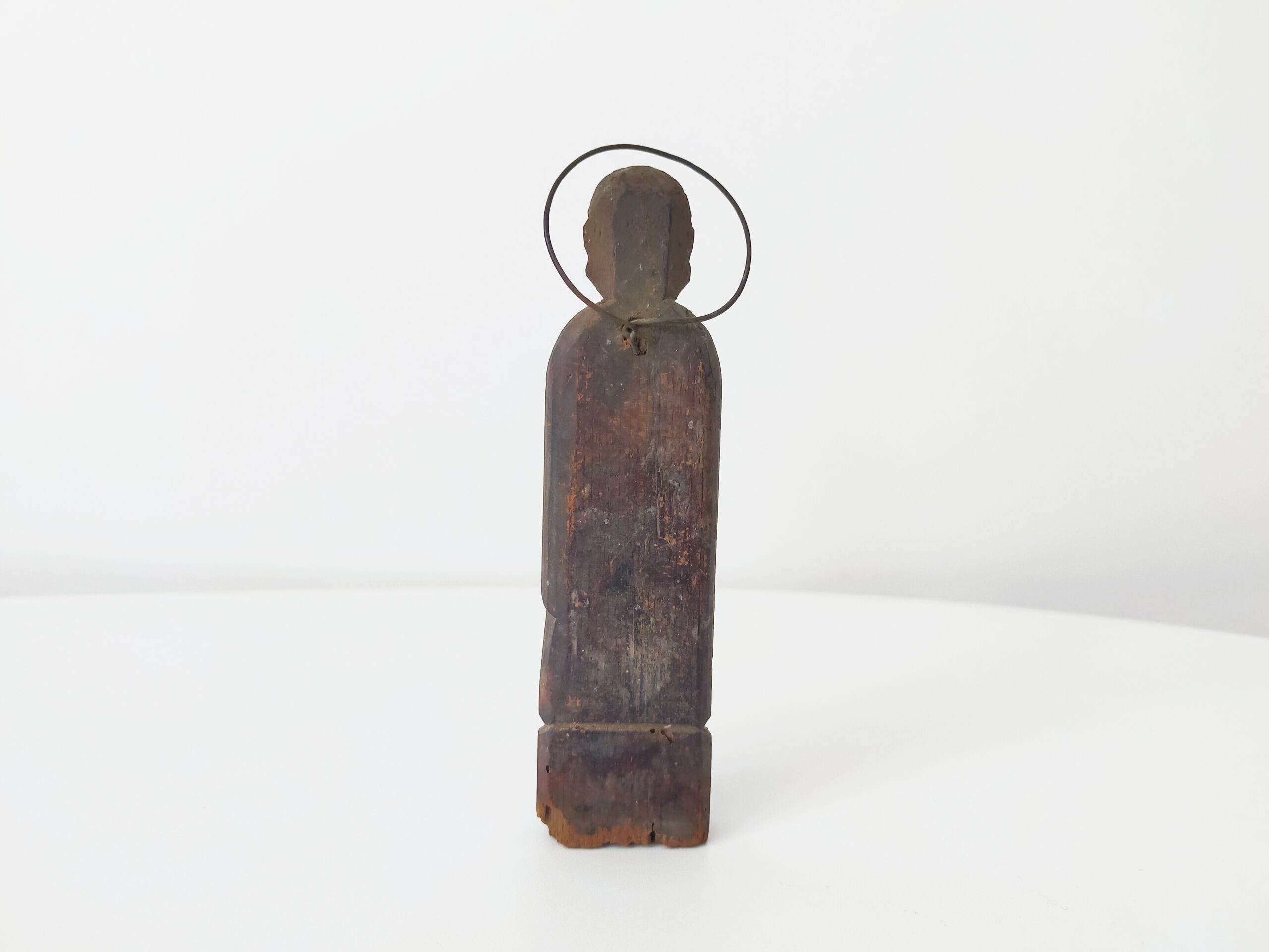 SENTAIBUTSU (Dealer: titcoRet) – A small wooden Jizō figure characterized by its simplified form and modest halo originated from a group of so-called Sentaibutsu (lit. “Thousand Buddhas”), large votive assemblages of similar devotional images dedicated in great numbers. Japan, Edo to Meiji period (19th century). Approx. 11 cm in height (4.3 in). Stands independently but is somewhat unstable. Evidence of age-related wear is present, including minor wormholes at the bottom with slight powder shedding. Condition as shown.