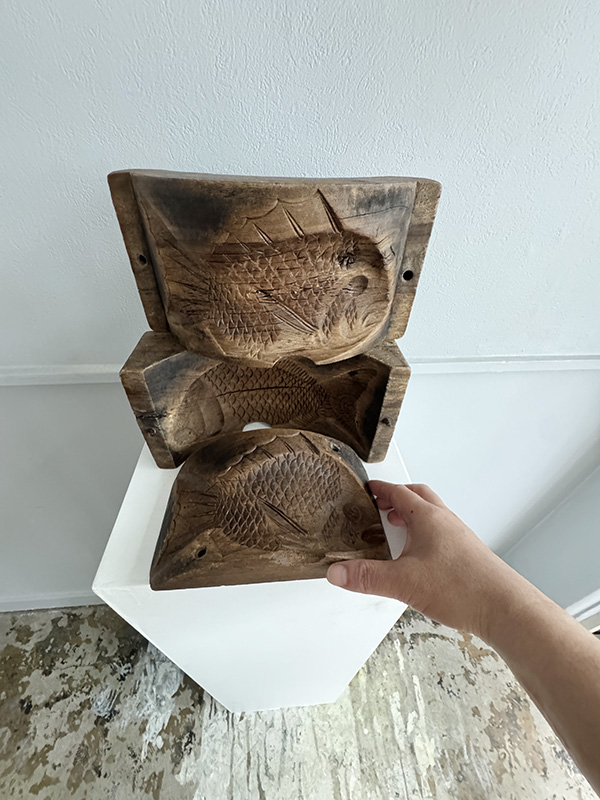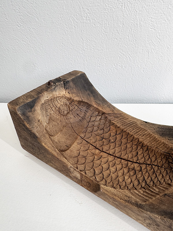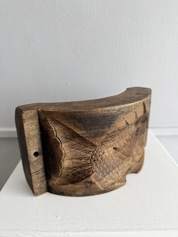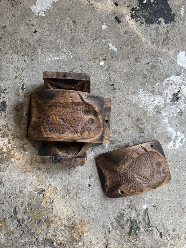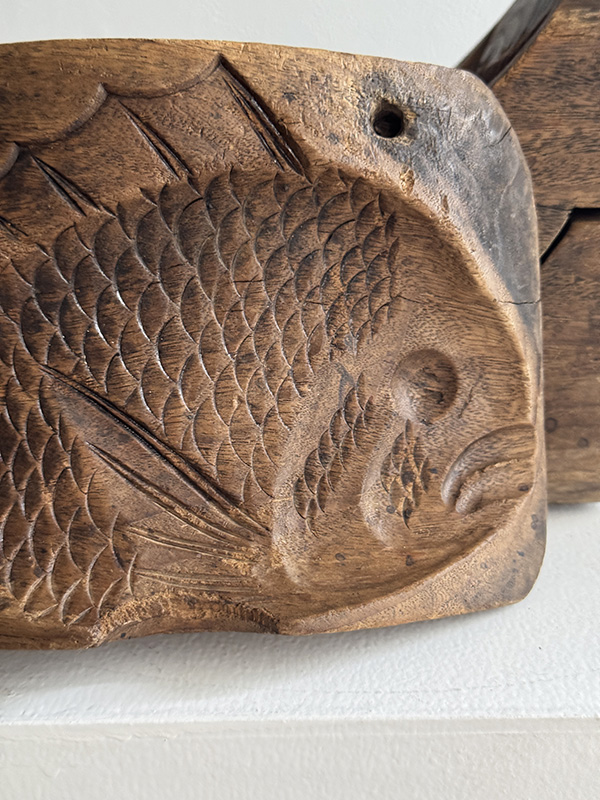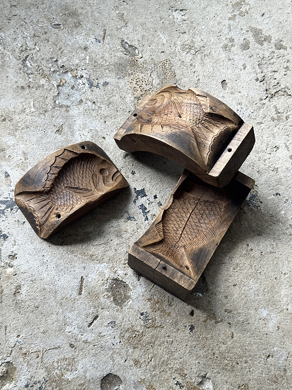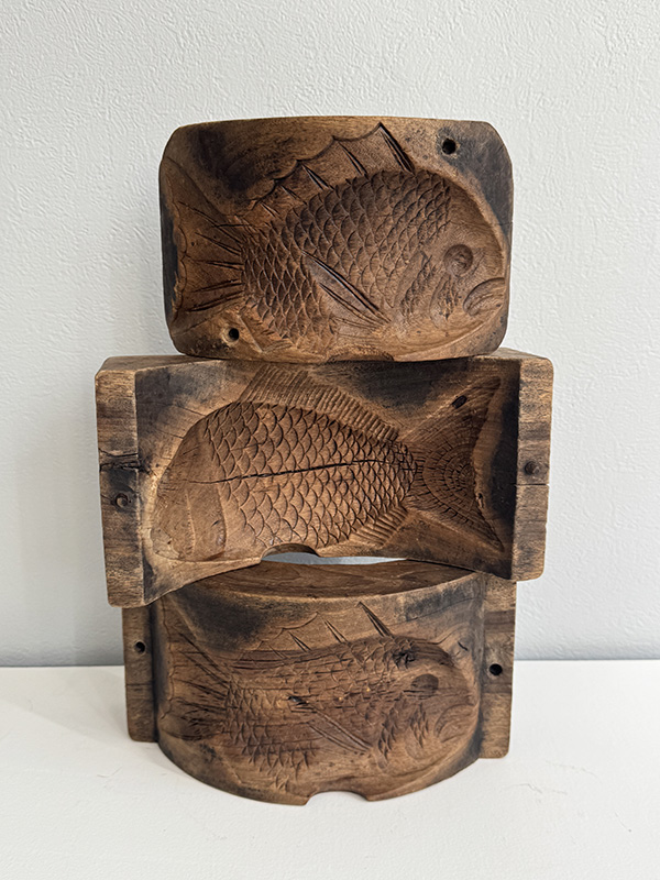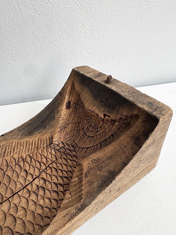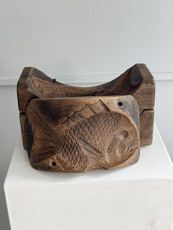 LARGE SEA BREAM KASHIGATA (Dealer: Jinta) – Large kashigata (traditional wooden confectionery mold) carved in the form of sea bream (tai), used for making Japanese wagashi sweets. Taishō to early Shōwa period (early 20th century). Approx. 14 × 25 × 13 cm (5.5 × 9.8 × 5.1 in). Regarded in Japan as an auspicious motif associated with weddings, childbirth celebrations, and longevity festivities. Given its impressive size, those molds were likely created and used for particularly significant occasions. Rich feeling of aged surface texture by long use. Condition as shown.