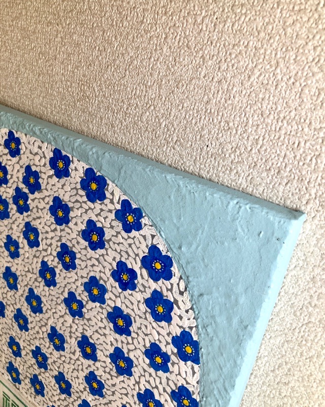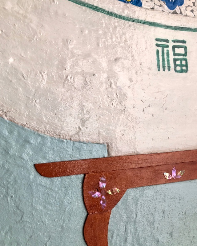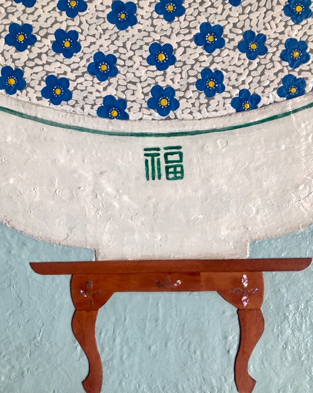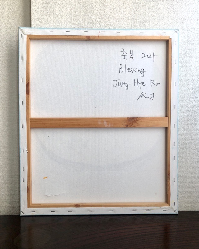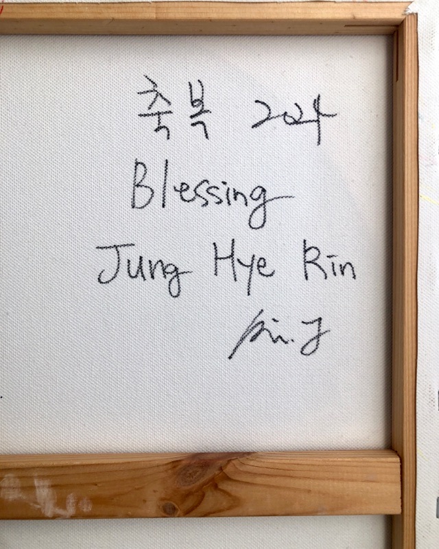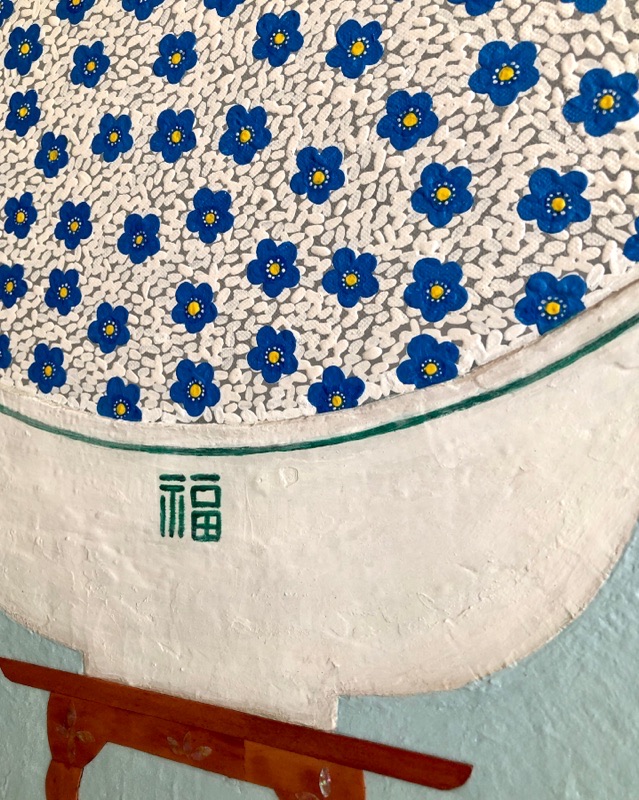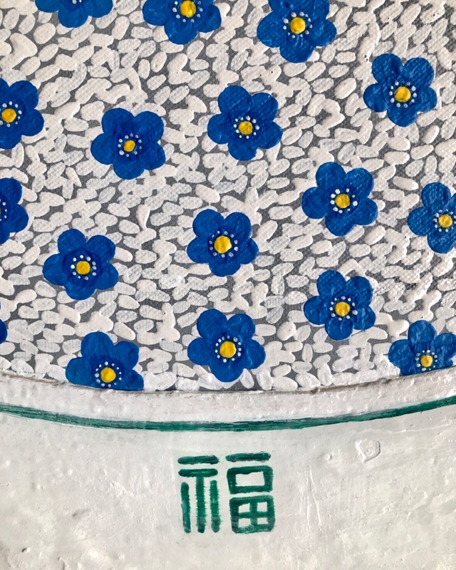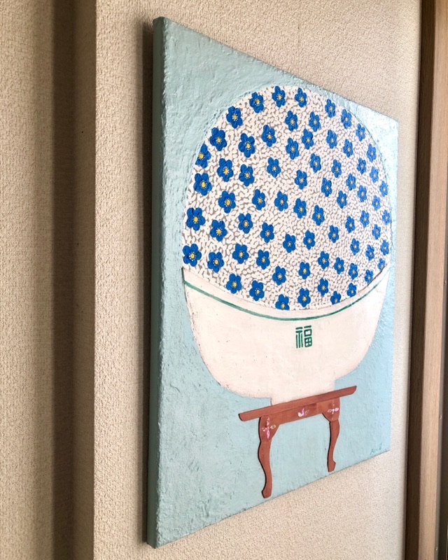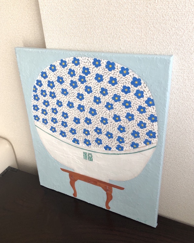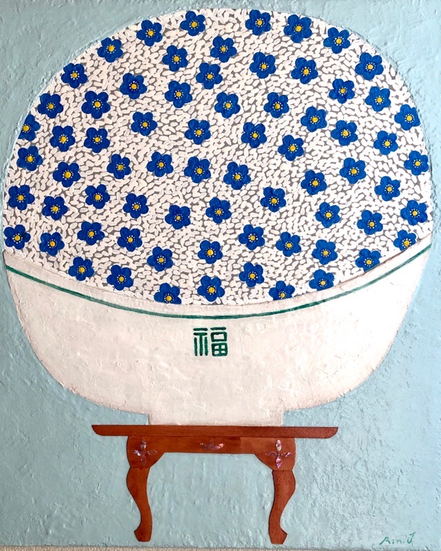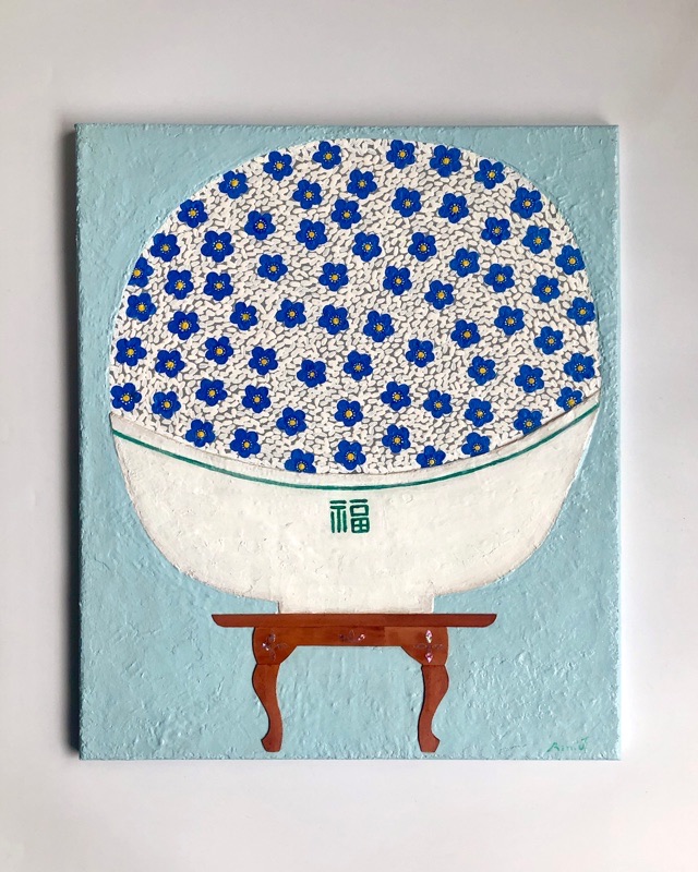 BLESSING (Dealer: kikue) – Mixed media on canvas. Korea, 2024. Approx. 52.5 × 45 × 2 cm (20.7 × 17.7 × 0.8 in). By Jung Hye Rin, a painter known for reimagining traditional Korean motifs with warmth and quiet humor. A traditional bowl, inscribed with “happiness”, full of rice, rises upon a horjokban (tray table with tiger-shaped legs), full in form — blessed.