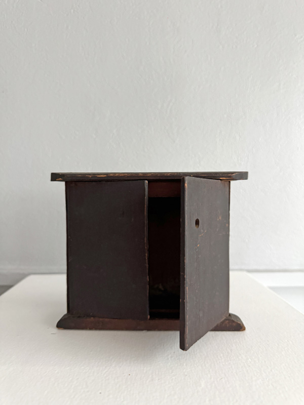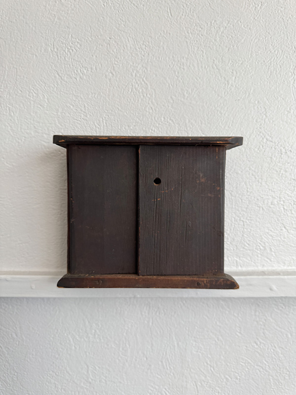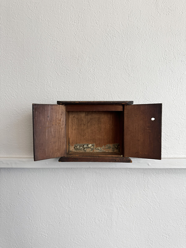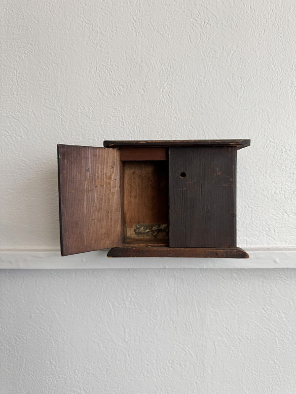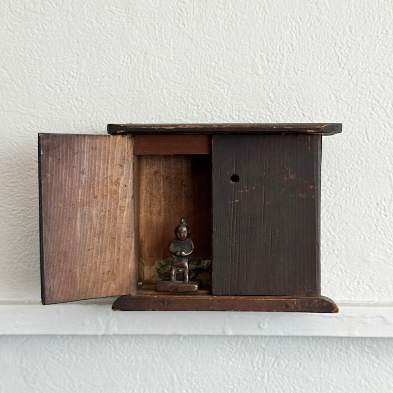RUSTIC ZUSHI (Dealer: Jinta) – A small, rustic wooden zushi shrine with simple yet dignified presence. Japan, Taishō – early Shōwa period (early 20th century). Approx. 13 × 16 × 6 cm (5.1 × 6.3 × 2.4 in). Condition as shown. (Figurine shown in the last photo is not included.)