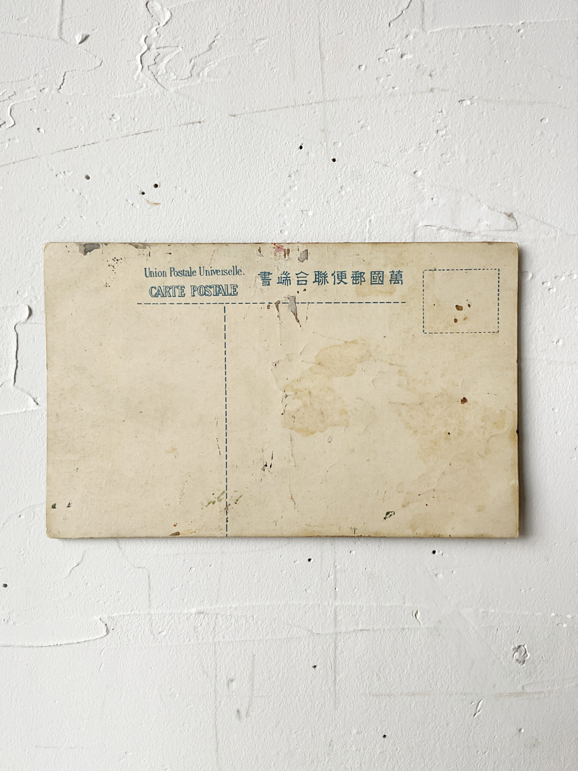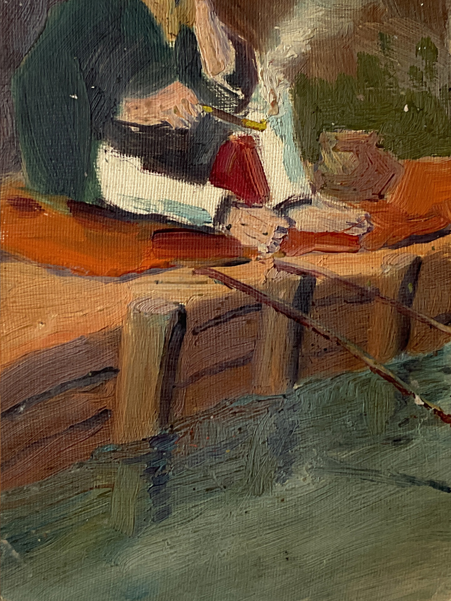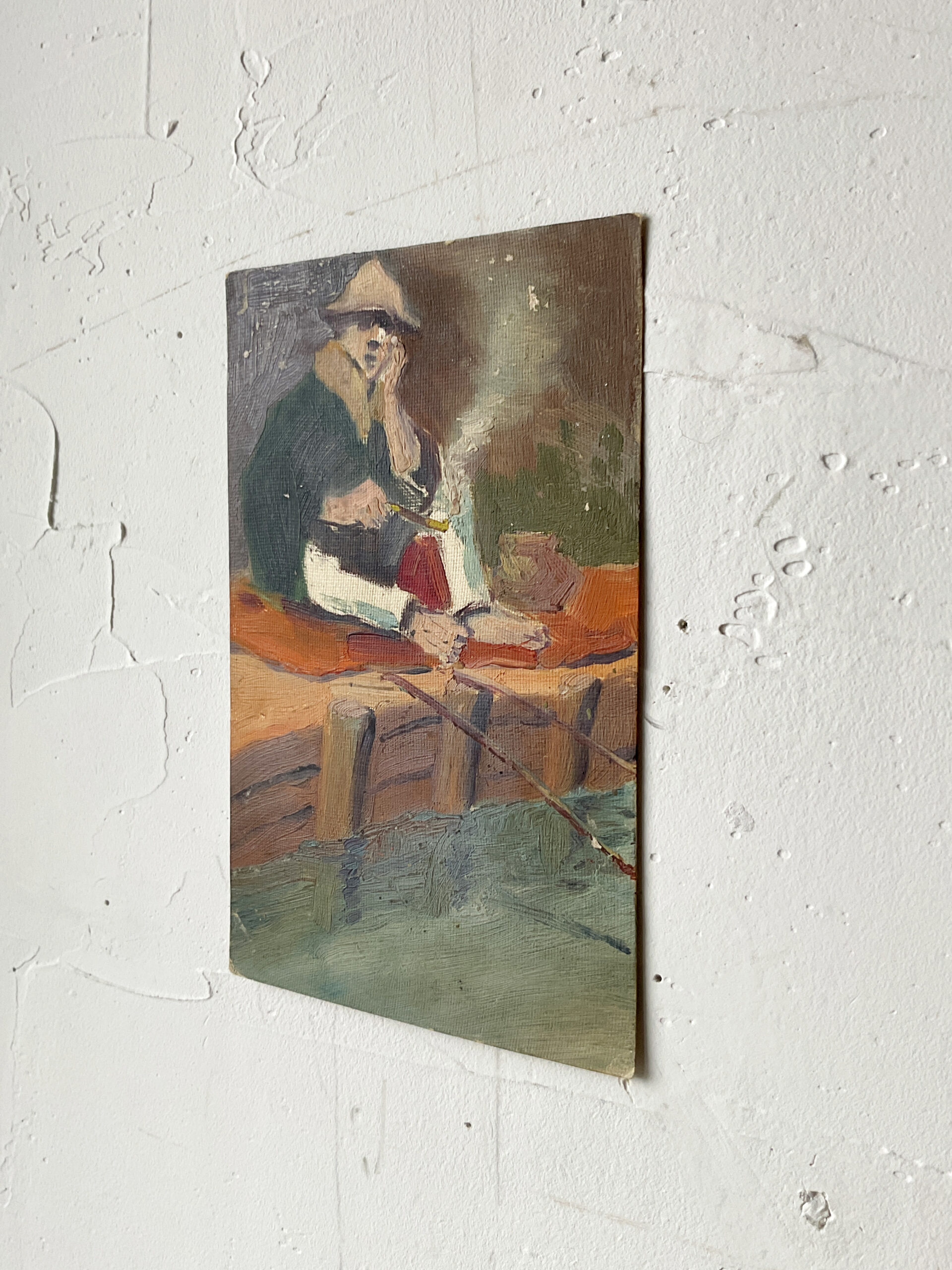 SMOKE AND WAIT (Dealer: hotoke) – Anonymous Japanese oil painting depicting an angler, executed directly on a vintage Japanese Universal Postal Union postcard. Pre-war period (before 1945). Approx. 8.8 × 14 cm (3.5 × 5.5 in).