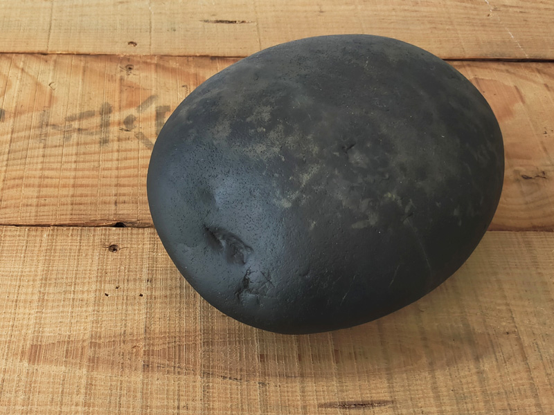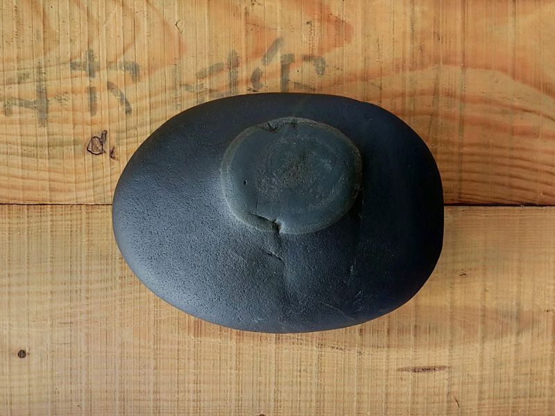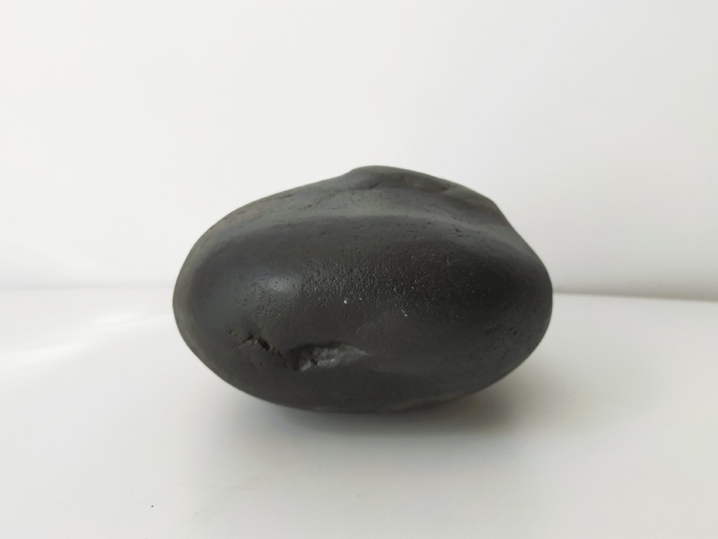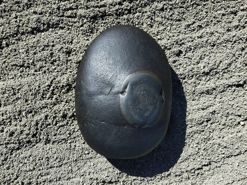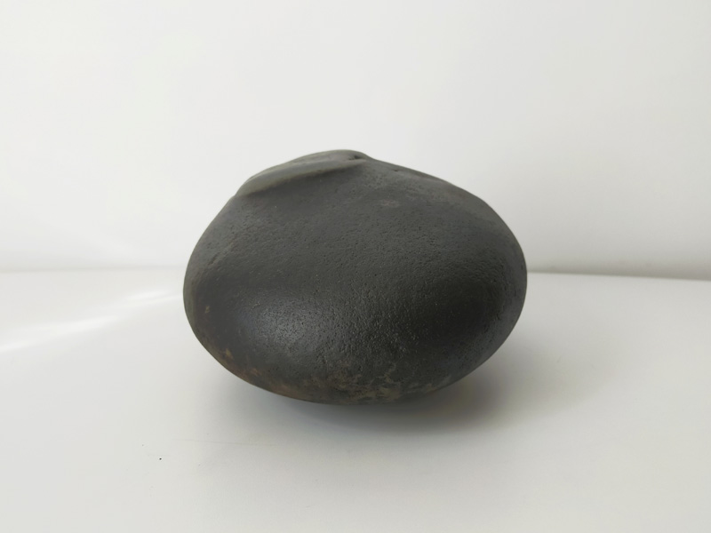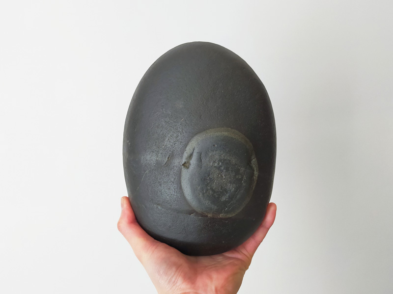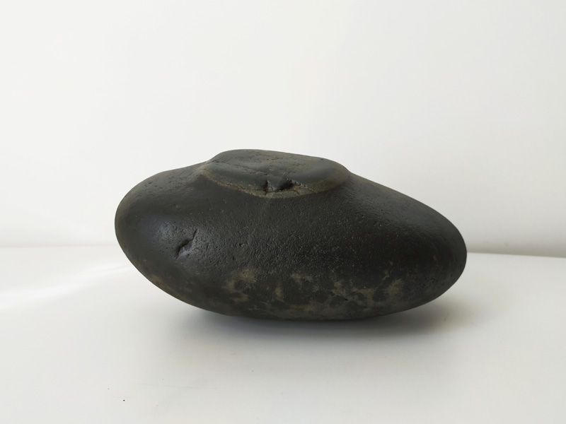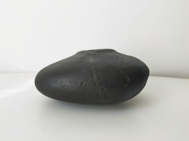 STONE WITH INNER CORE (Dealer: titcoRet) – A mysterious natural suiseki stone distinguished by a partially raised, double-layered structure emerging from within, as if revealing an inner core. Collected from the Ashoro River, Hokkaidō, Japan. Approx. 20 × 15 × 9 cm (7.9 × 5.9 × 3.5 in). Referred to as taishi (“womb stones”) and are regarded in certain folk beliefs as symbolic of inner life, or as stones “bearing a child,” occasionally becoming objects of quiet veneration. Age-related natural wear is present. Condition as shown.