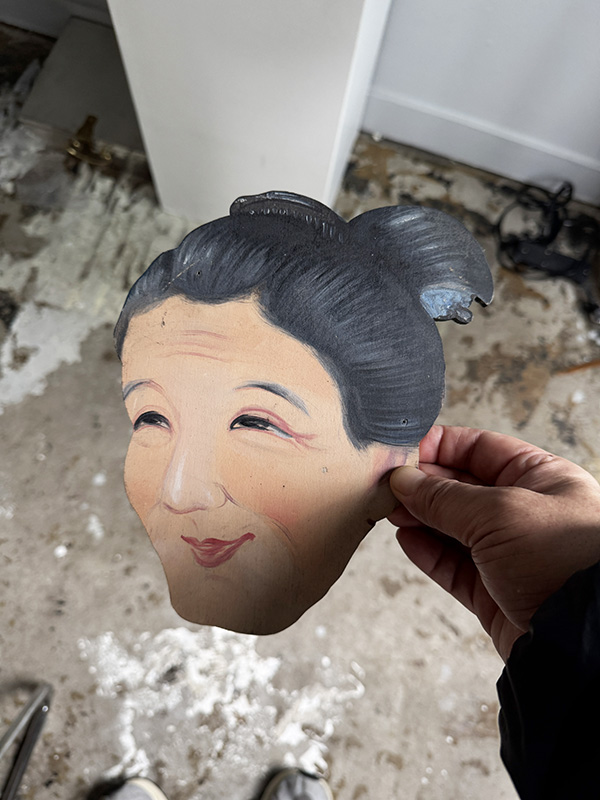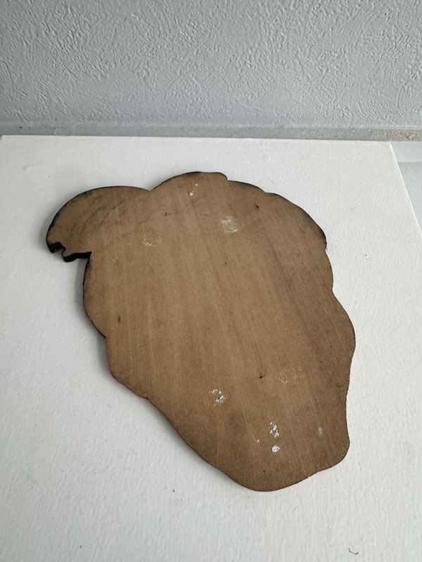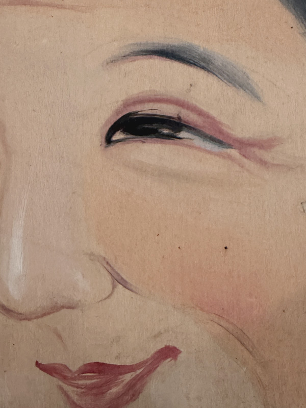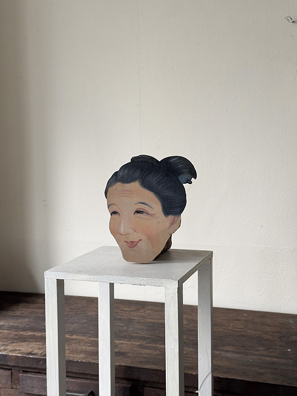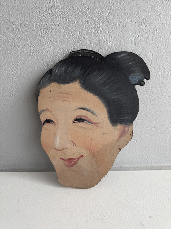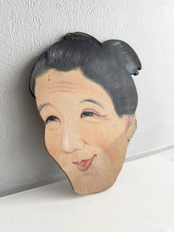 OLD WOMAN (Dealer: Jinta) – Hand-painted wooden signboard, Japan, Shōwa period, circa 1960s. Approx. 17 × 20 cm (6.7 × 7.9 in), thickness approx. 5 mm (0.2 in). Believed to have been used as an interior sign for a kimono or textile shop. The gentle expression conveys a quiet warmth. Condition as shown, with age-related wear.