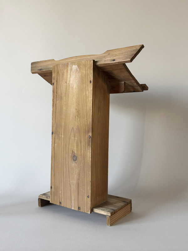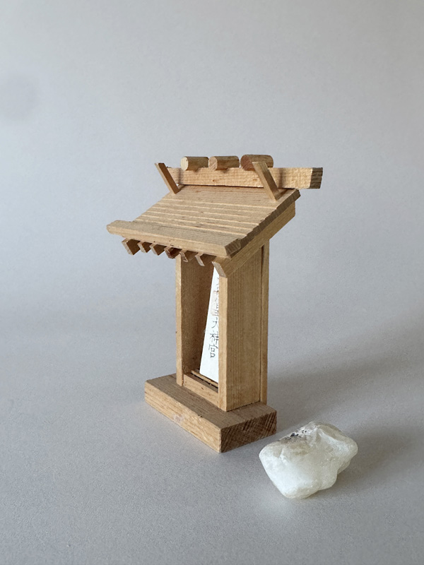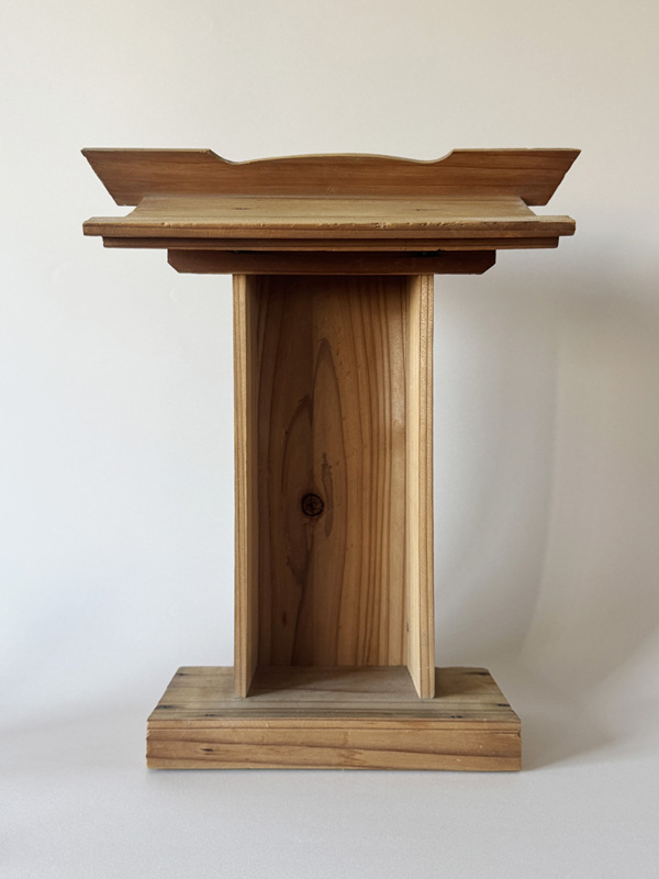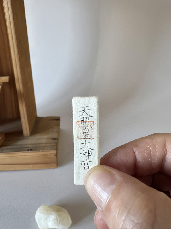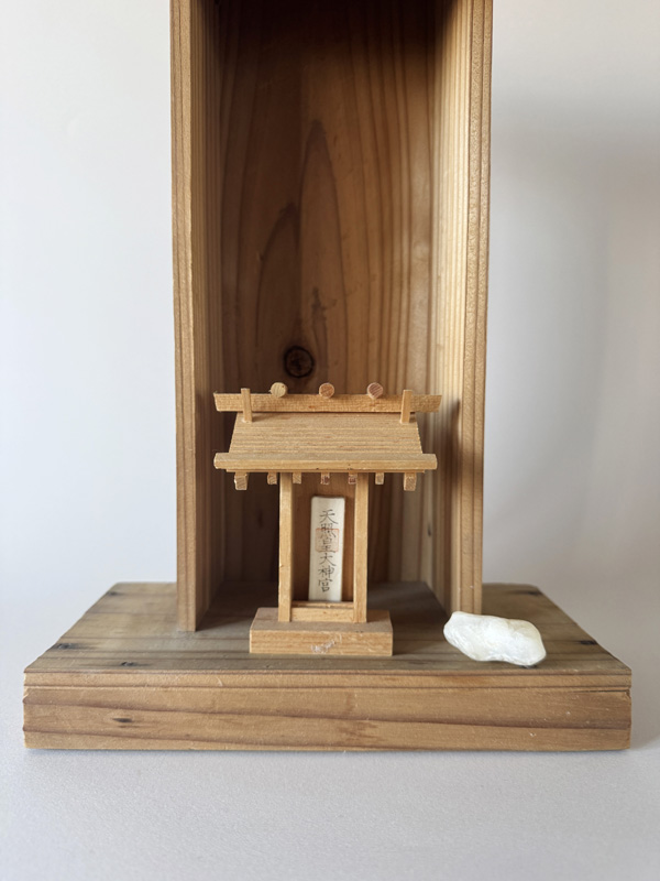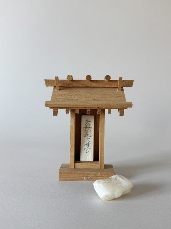 KAMIDANA (Dealer: Jinta) – Wooden Shinto household altar set including a small amulet from Ise Grand Shrine and a stone, Japan, circa 1970s. Large: approx. 35 × 30 × D 10.5 cm (13.8 × 11.8 × 4.1 in); Small: approx. 9 × 8 × D 3.3 cm (3.5 × 3.1 × 1.3 in). In Japanese custom, a kamidana is ideally placed facing south. Condition as shown.