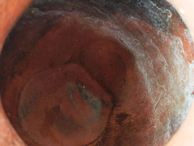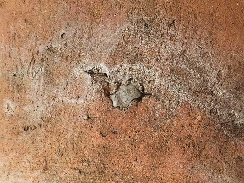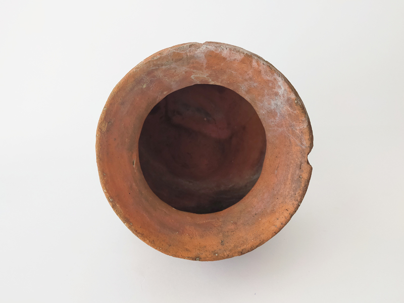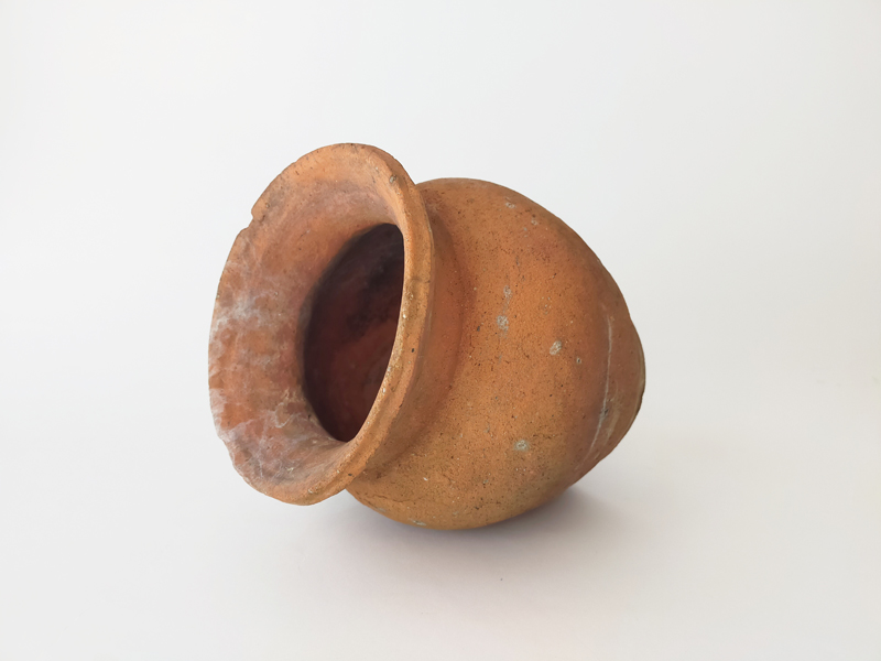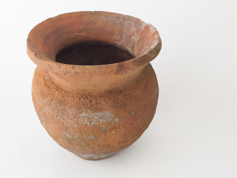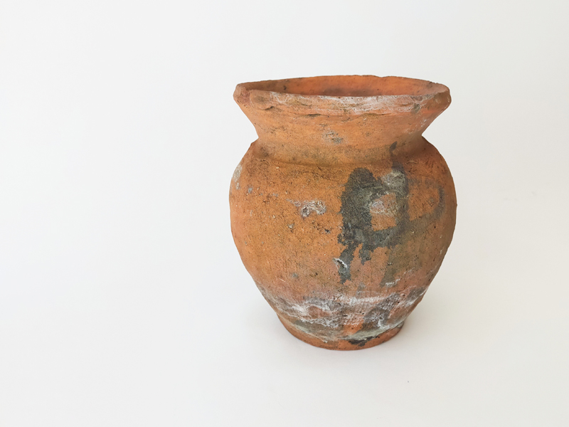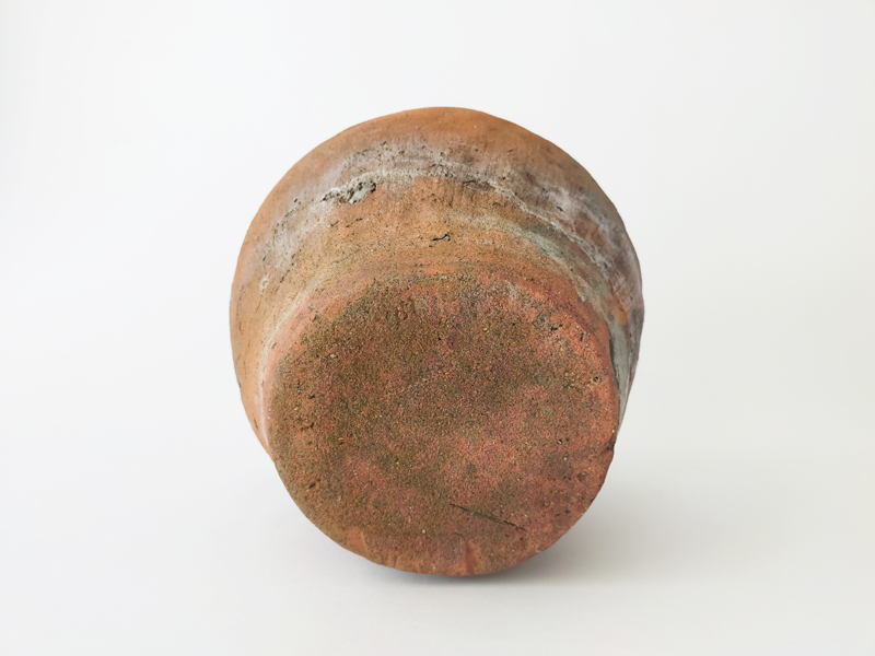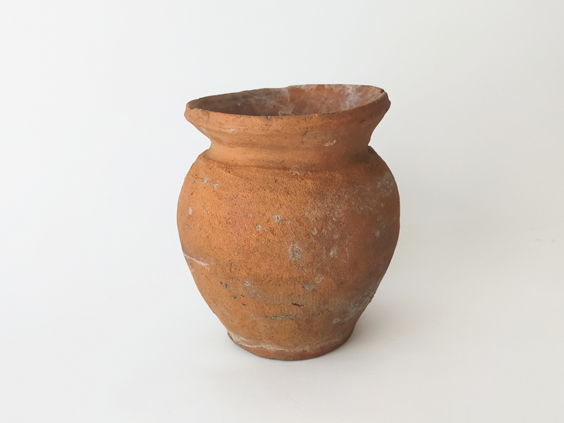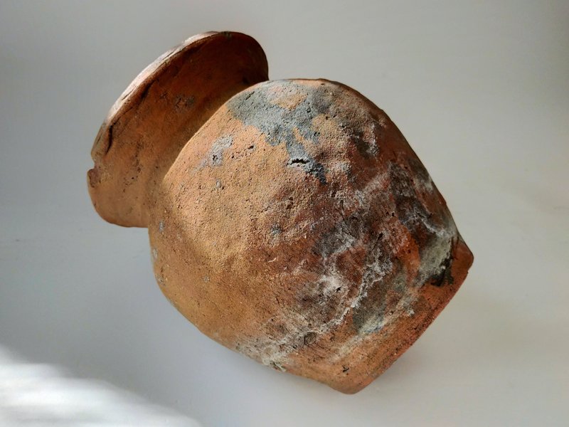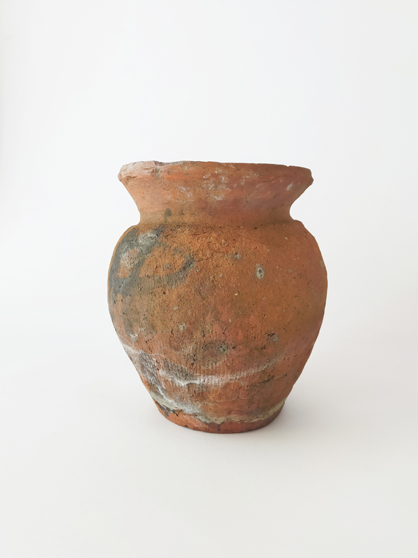 INK-INSCRIBED EARTHENWARE (Dealer: titcoRet) – Unglazed earthenware jar with ink inscriptions, commonly referred to as Bokusho-doki (“ink-inscribed earthenware”). Japan, 17th–19th century (early modern period). Approx. 21 cm (8.3 in) in height. The white surface deposits are minerals and cannot be removed by washing. Age-related wear consistent with time.