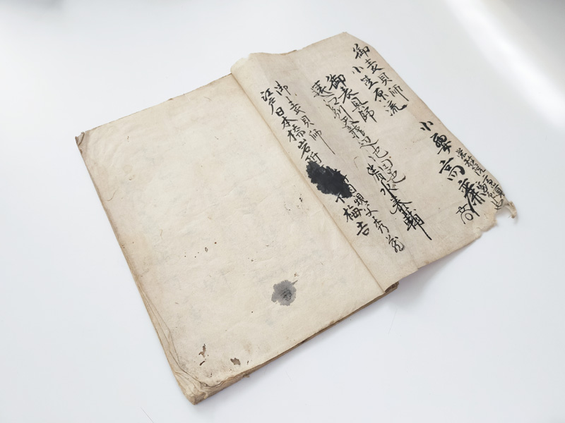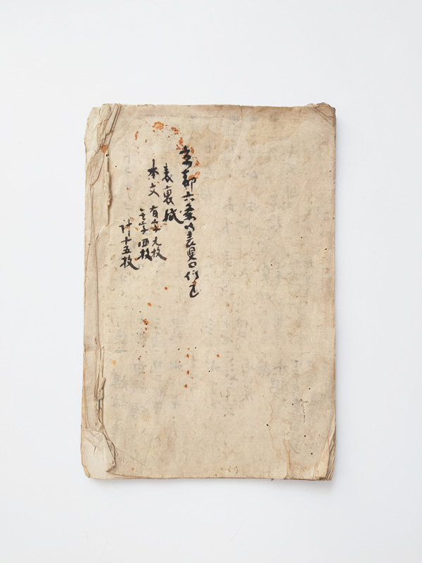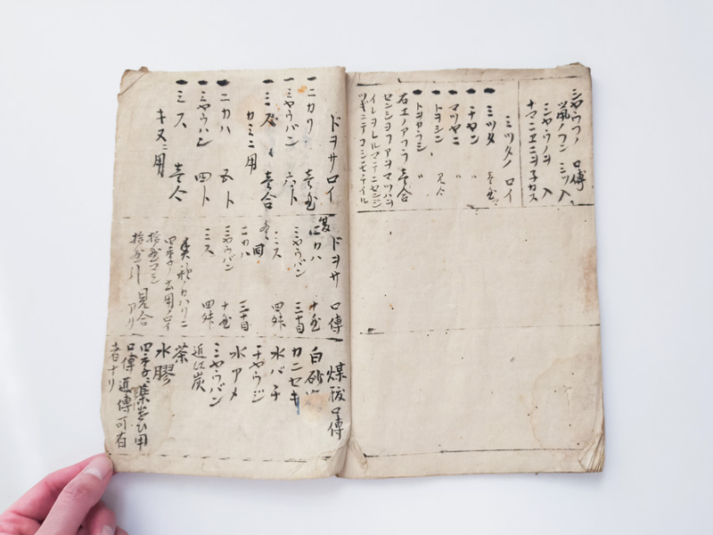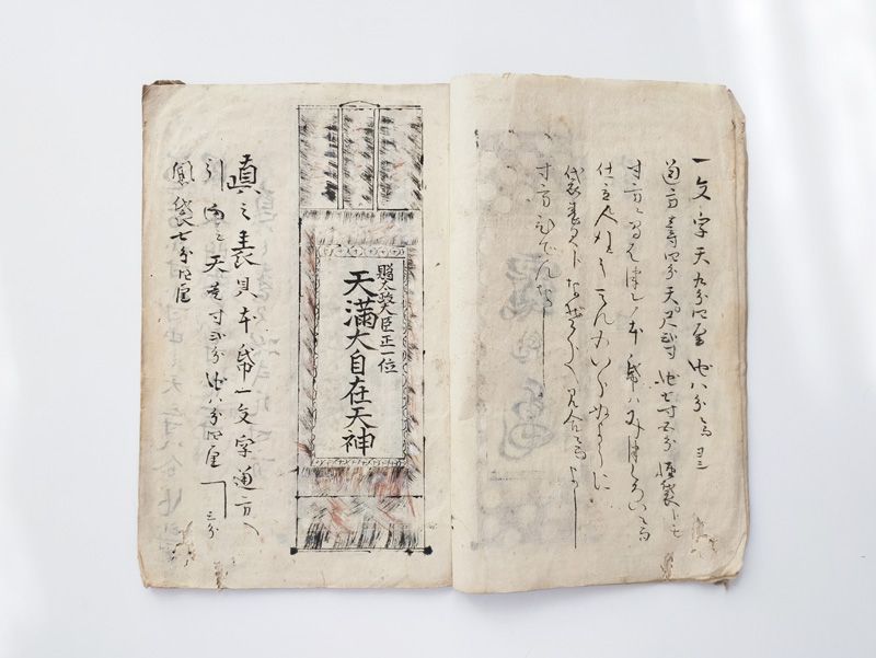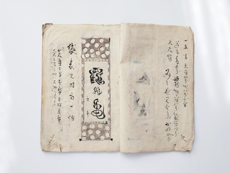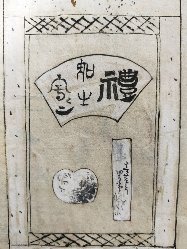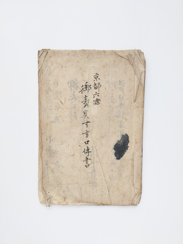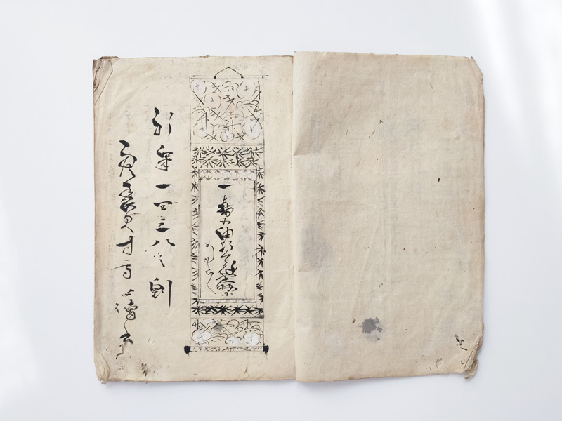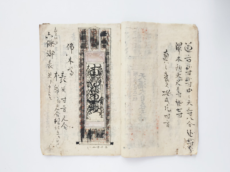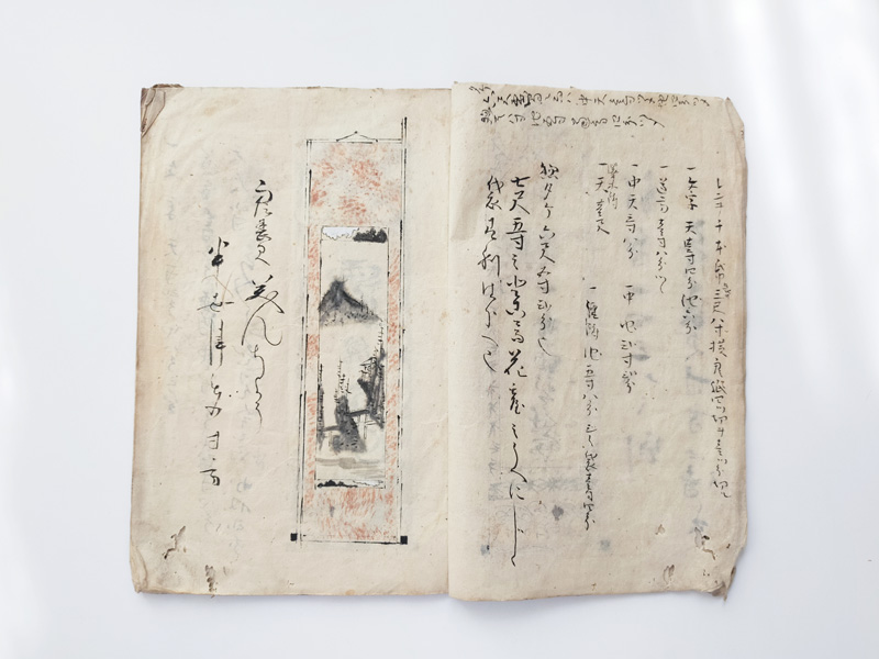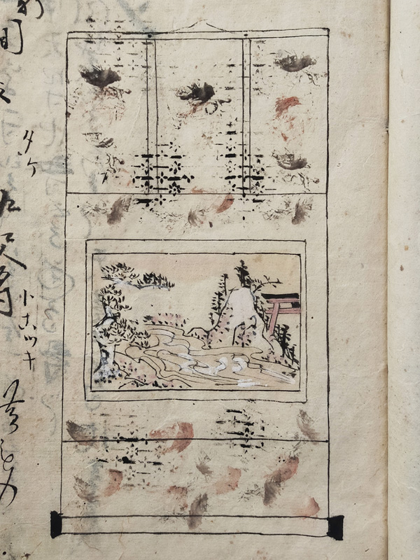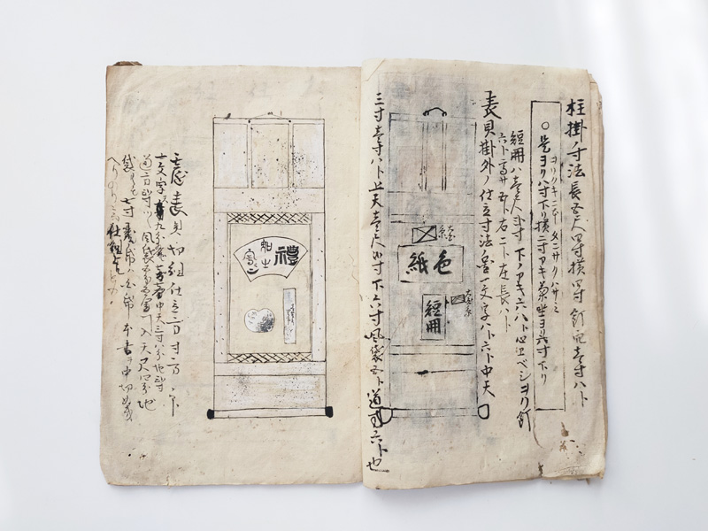 SCROLL DESIGN MANUAL (Dealer: titcoRet) – Paper manual detailing the dimensions, layout, and materials for Ogasawara-ryū scroll mounting, created by a hyōgushi (traditional mounting artisan) from Rokujō, Kyoto. Japan, Meiji period (late 19th–early 20th century). Approx. 26.5 × 17.5 cm (10.4 × 6.9 in); includes 17 illustrated/text pages. Age-related wear and insect damage present, as shown.