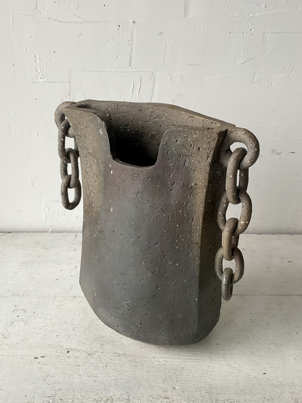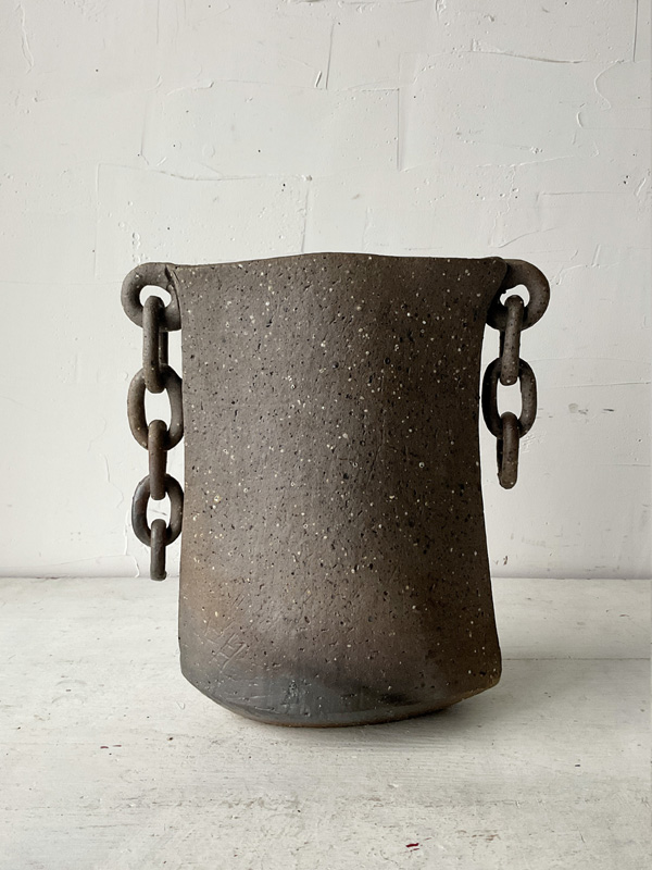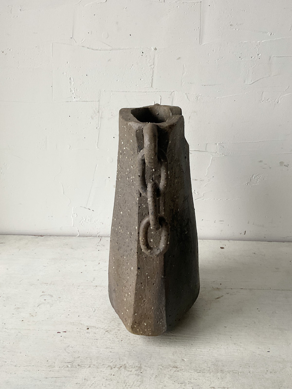 VASE BY AKIRA (Dealer: hotoke) – Anonymous high-fired unglazed stoneware vase with an avant-garde design. Signed with the kanji character “Akira.” Japan, circa 1990s-2000s. Approx. 24 × 22 × 11 cm (9.4 × 8.7 × 4.3 in). Condition as shown.