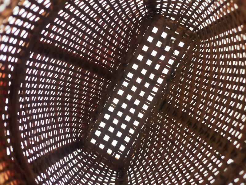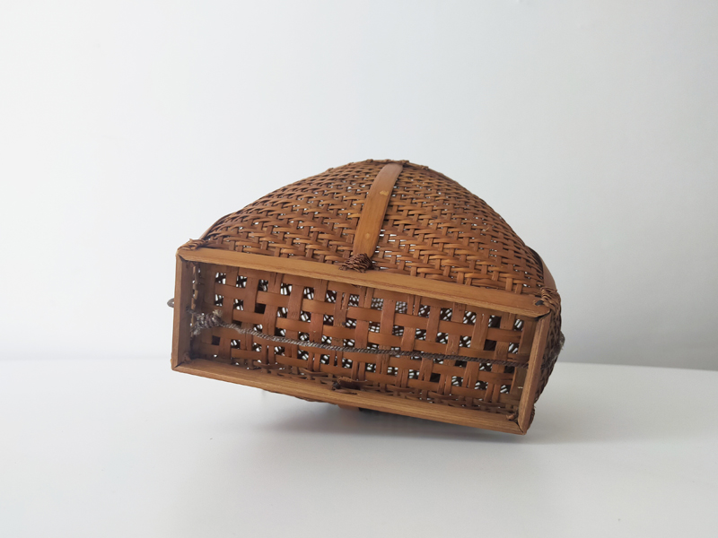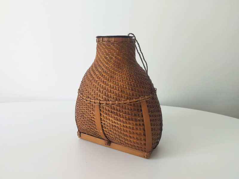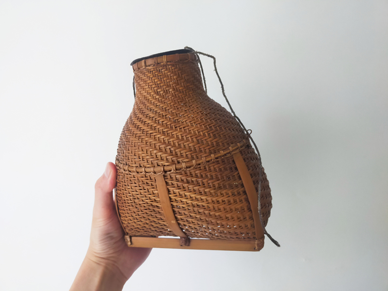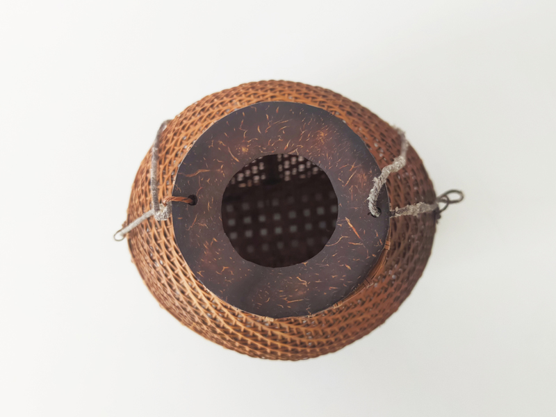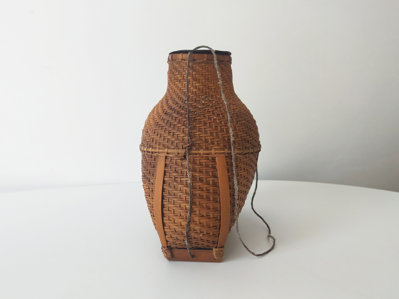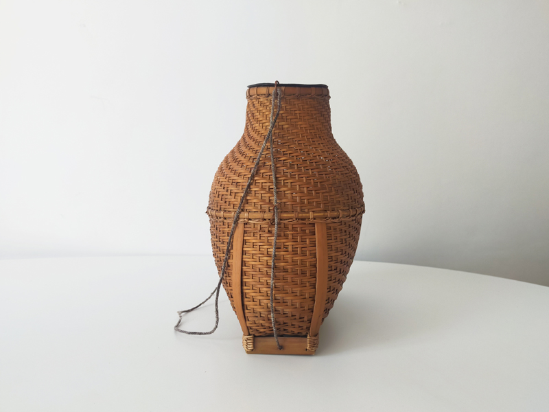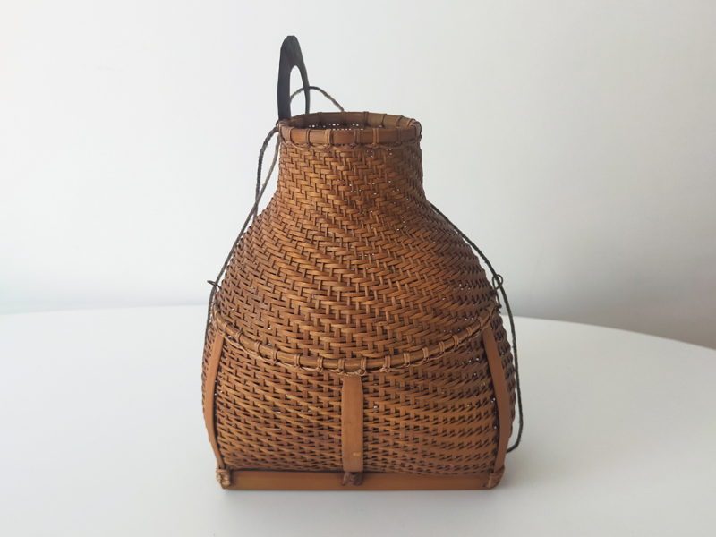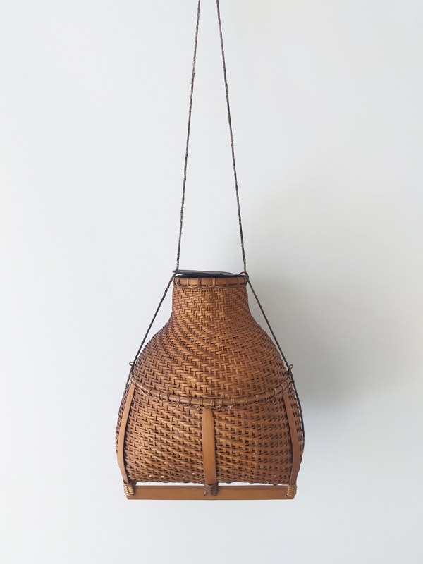 FLOWERING CREEL (Dealer: titcoRet) – Originally a woven bamboo biku (fishing creel), reinterpreted as a hanging flower vase in the wabi aesthetic of the tea ceremony. Japan, Shōwa period, 20th century. Approx. H 20 × W 16 × D 12 cm (7.9 × 6.3 × 4.7 in). Well-preserved and unused, with only minor age-related wear.