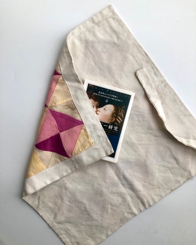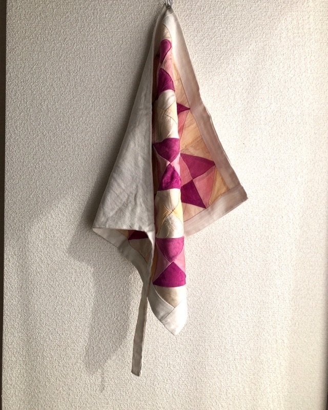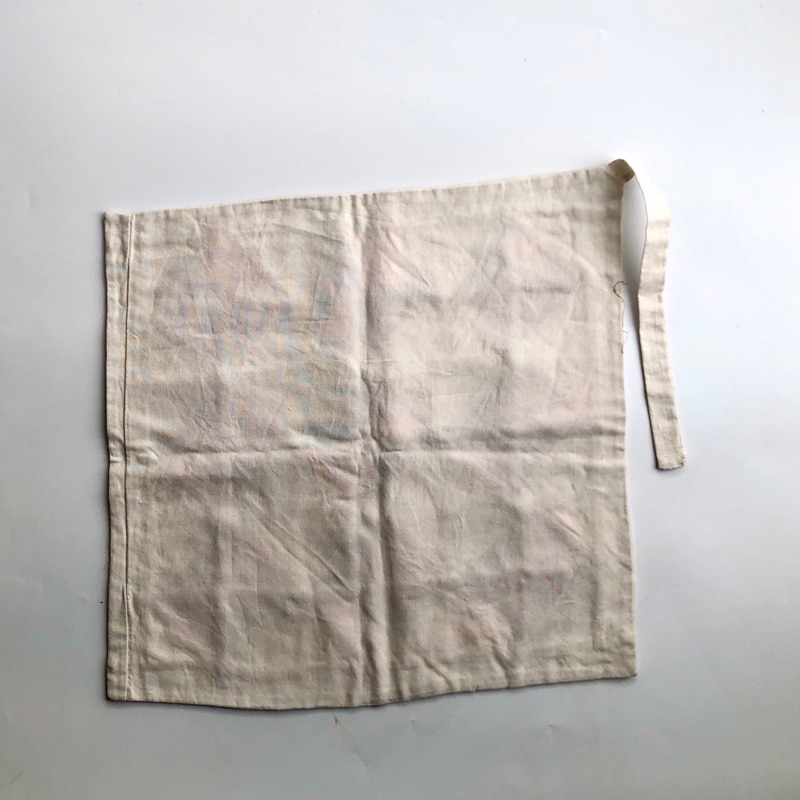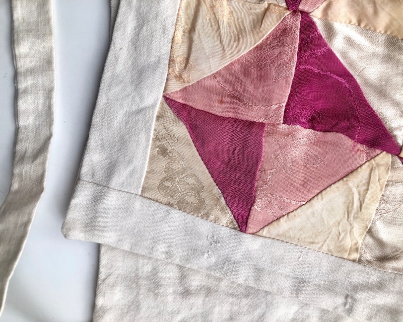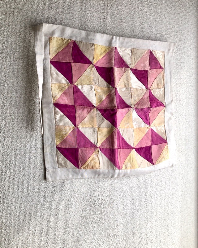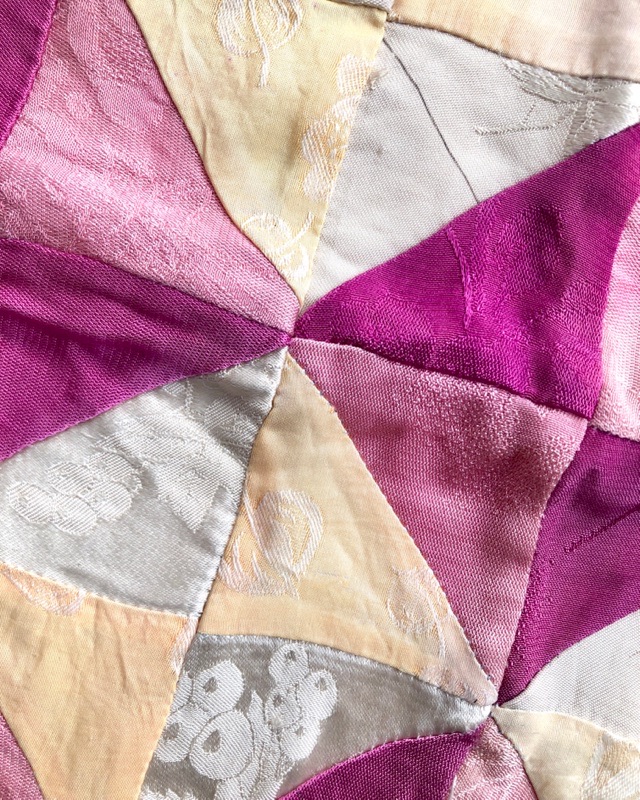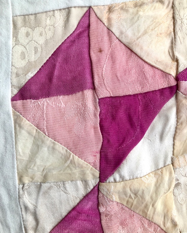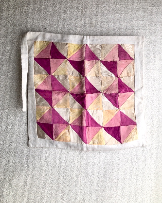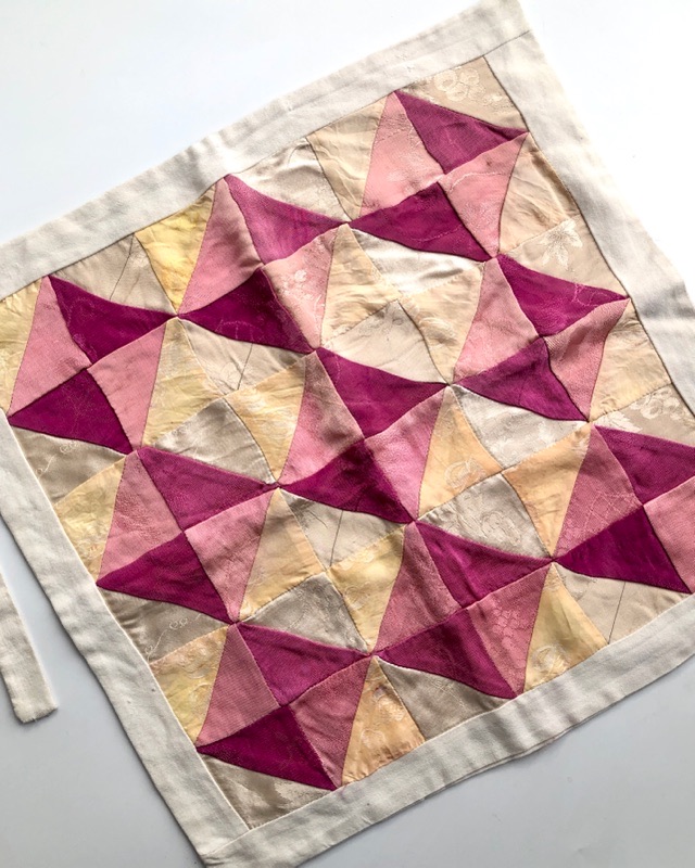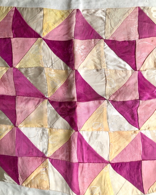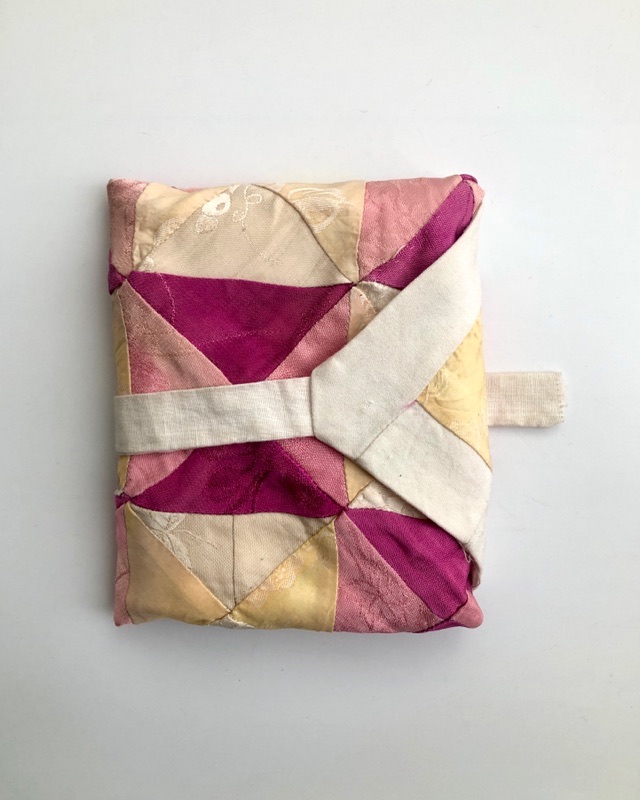 SMALL POJAGI (Dealer: kikue) – Traditional Korean patchwork textile made of silk and cotton, known as pojagi (or bojagi). Early 20th century. Approx. 39 × 39.5 cm (15.4 × 15.6 in). Constructed with two layers of fabric, giving it a sturdy feel despite minor fraying, discoloration, and stains consistent with age. The silk ground features a subtle woven botanical pattern, adding quiet depth to its simple composition.