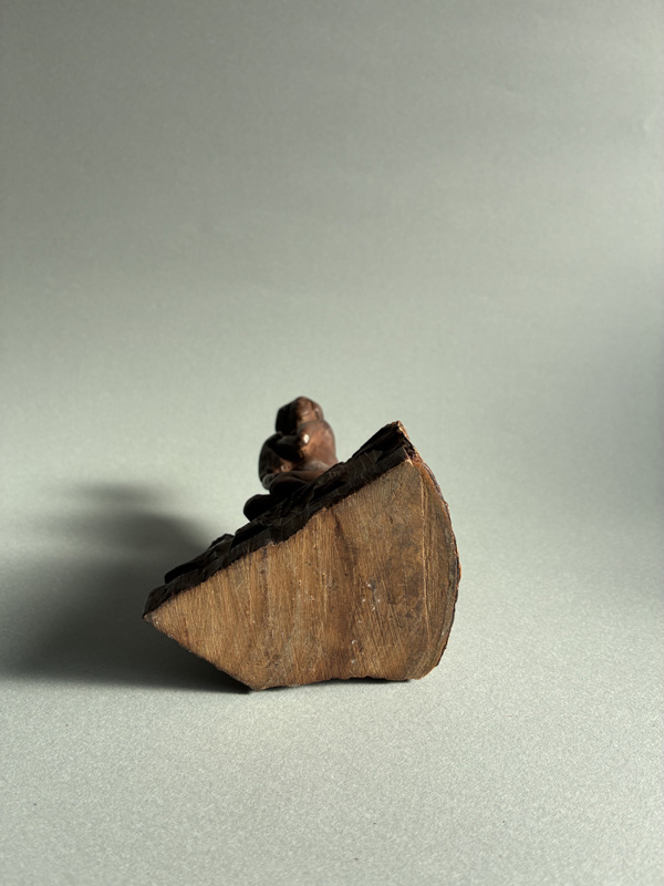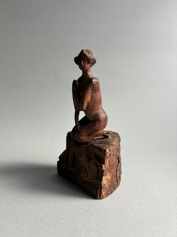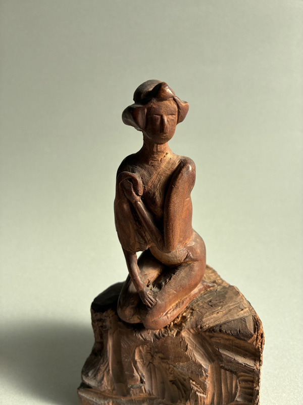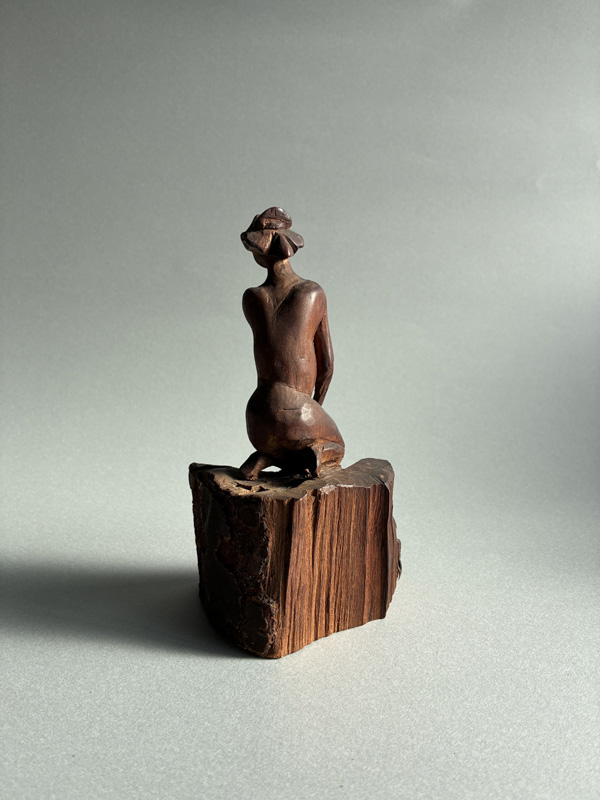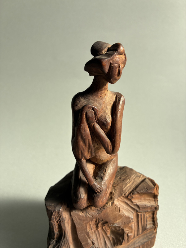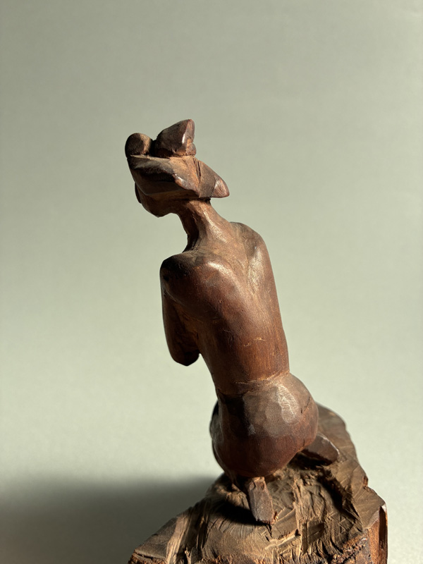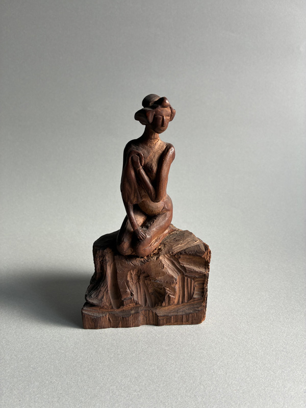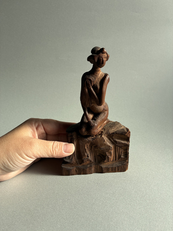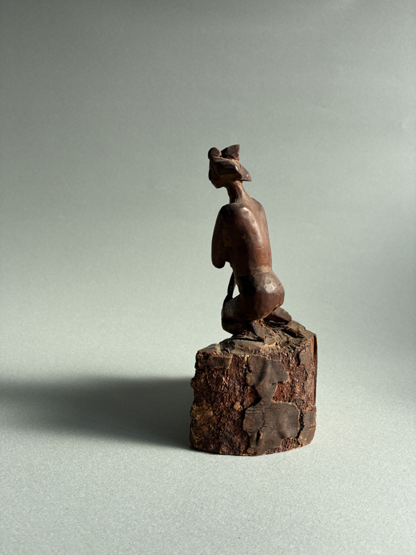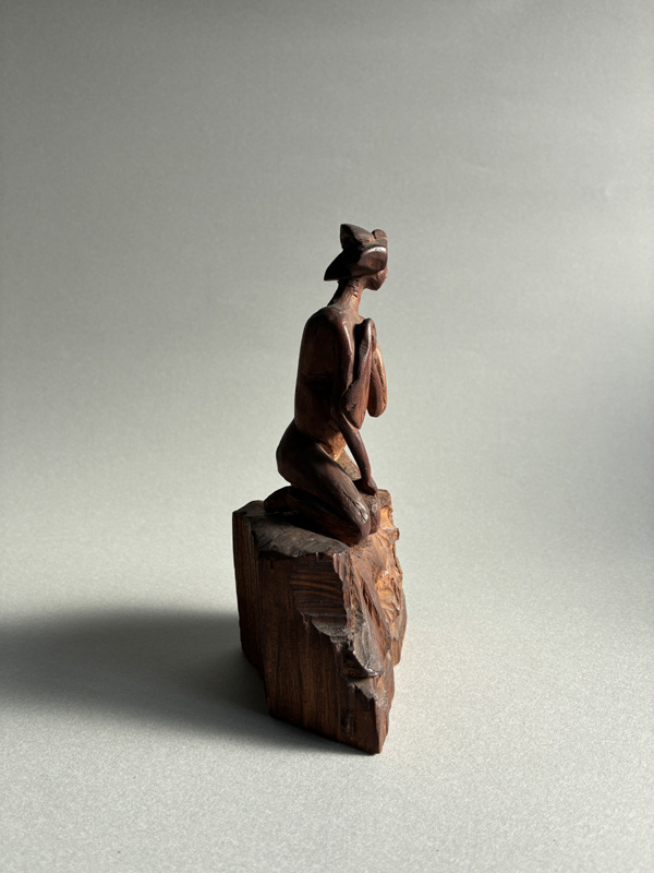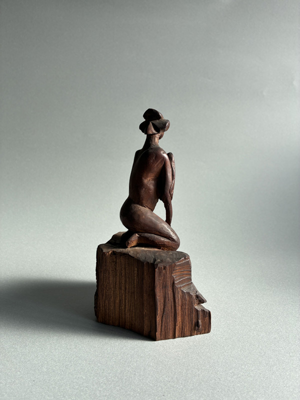 BATHING (Dealer: Pottari) – Carved wooden figure of an oiran (courtesan) bathing. Japan, Shōwa period, 20th century. Approx. 16 × 9 × 6 cm (6.3 × 3.5 × 2.4 in). No chips or losses.